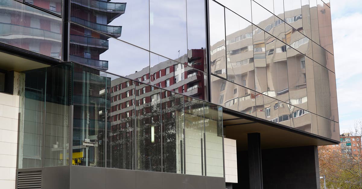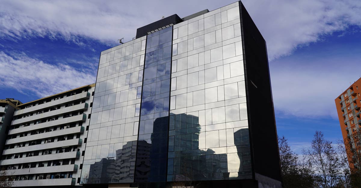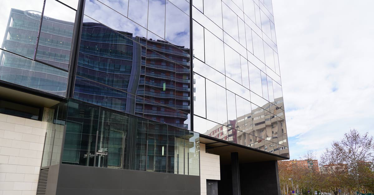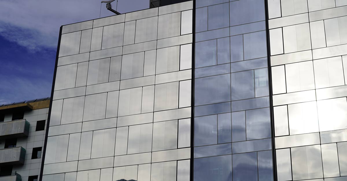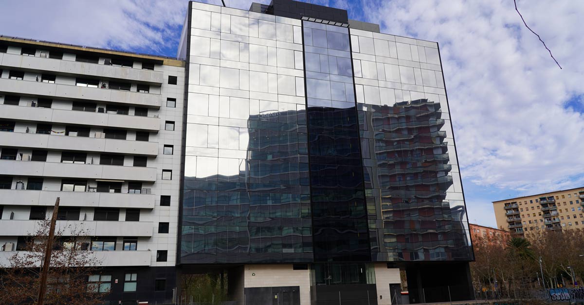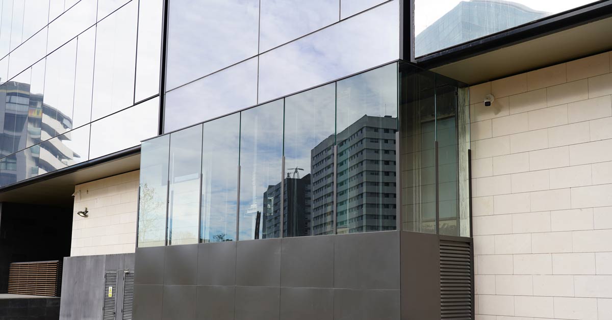 Rehabilitation of the façade in a business building, with the manufacture and installation of a new section of curtain wall, fire-fighting sectorizations and installation of projecting opening motorized enclosures.