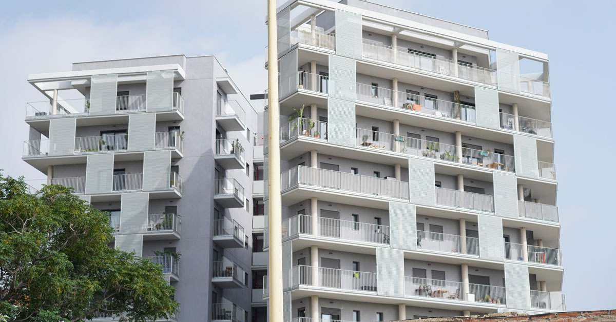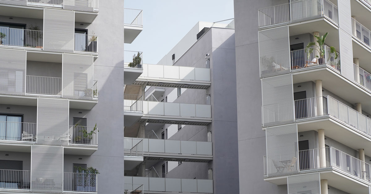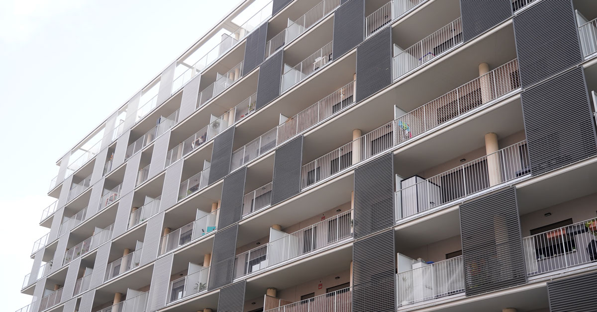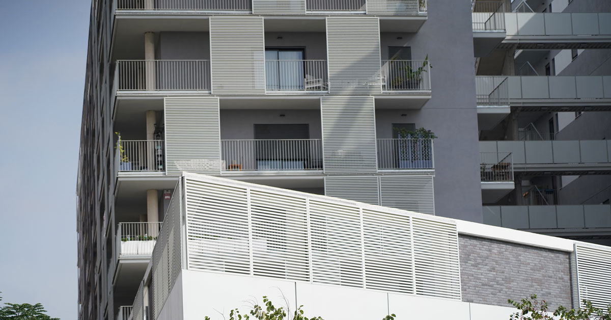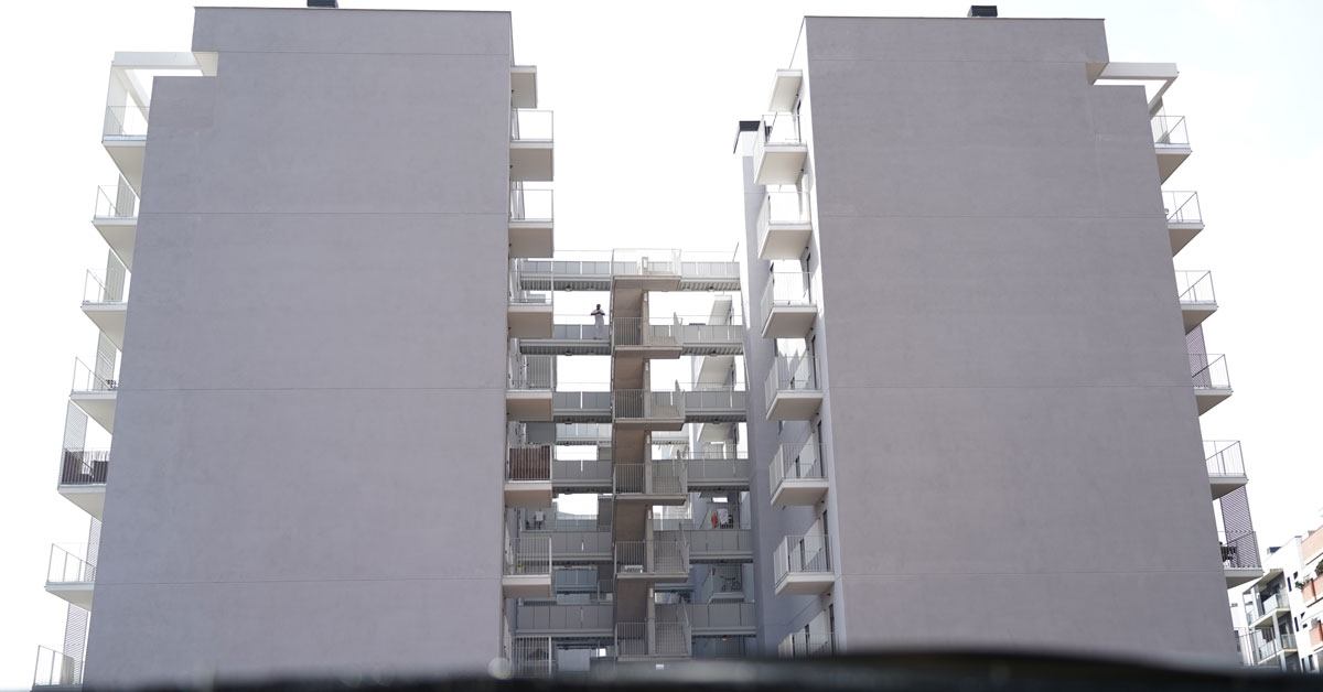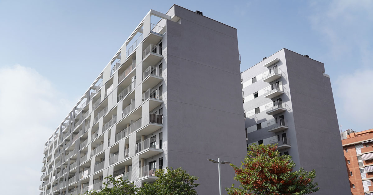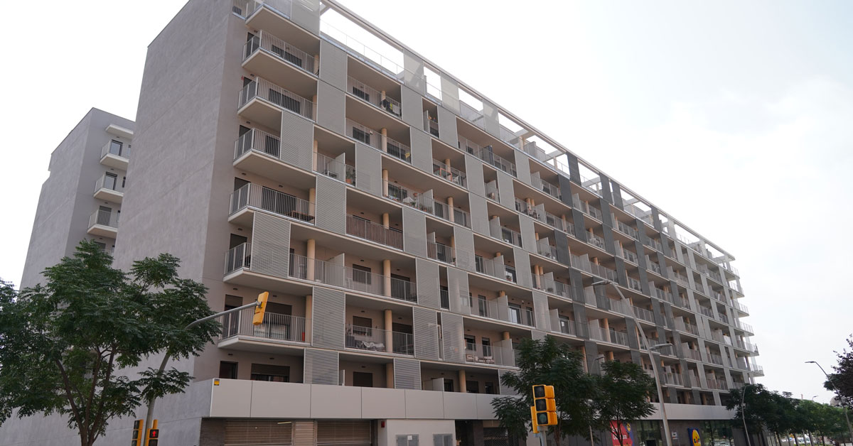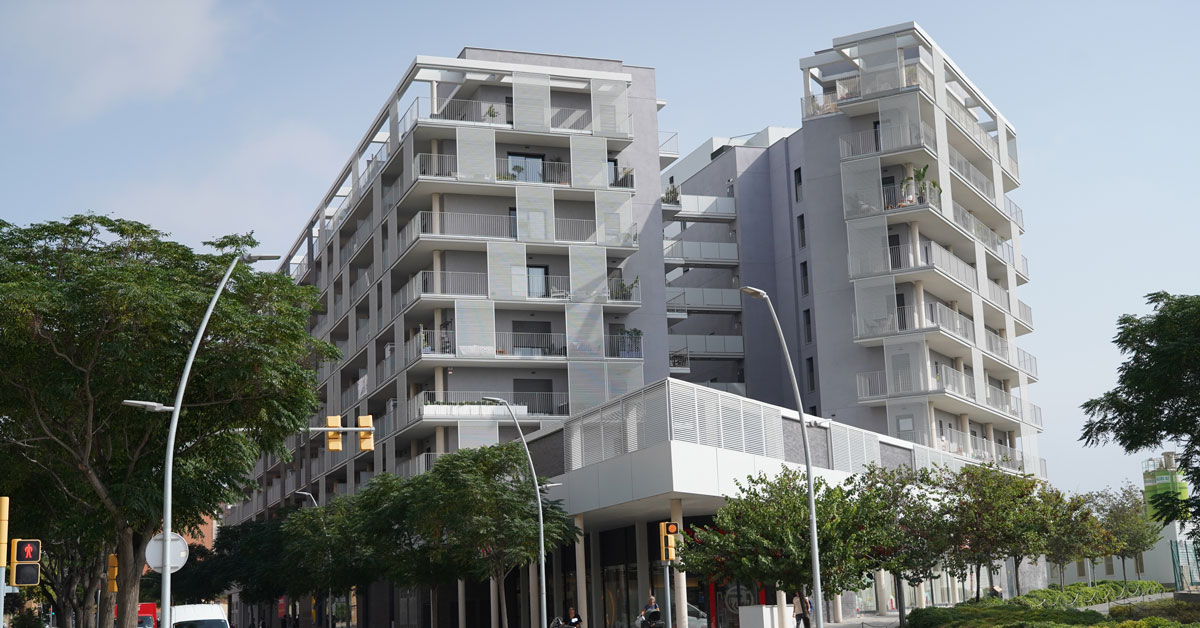 Manufacture and installation of 880 aluminum and glass enclosures, with sliding and practicable hidden leaf openings, with thermal break, for a building of 180 new development homes in the La Sagrera neighborhood, in Barcelona.
