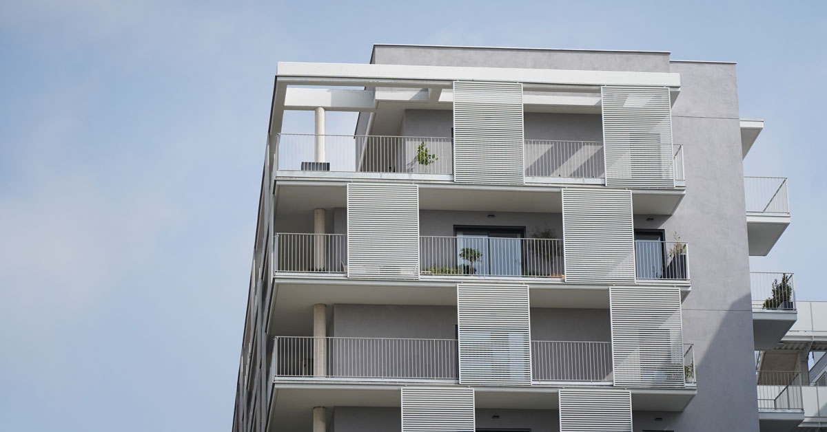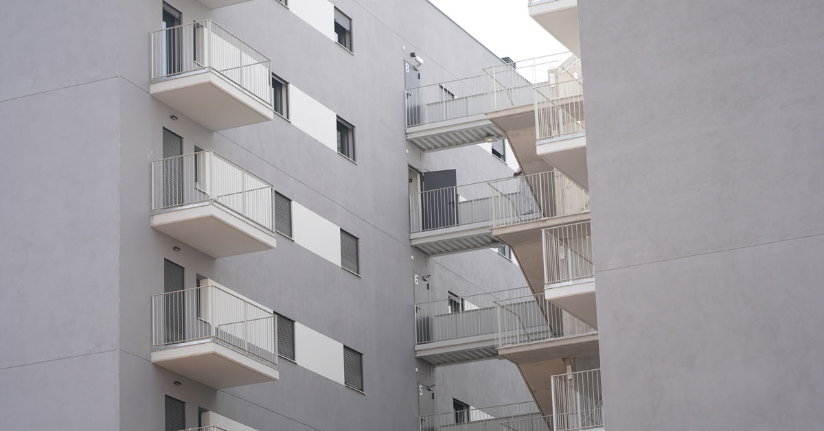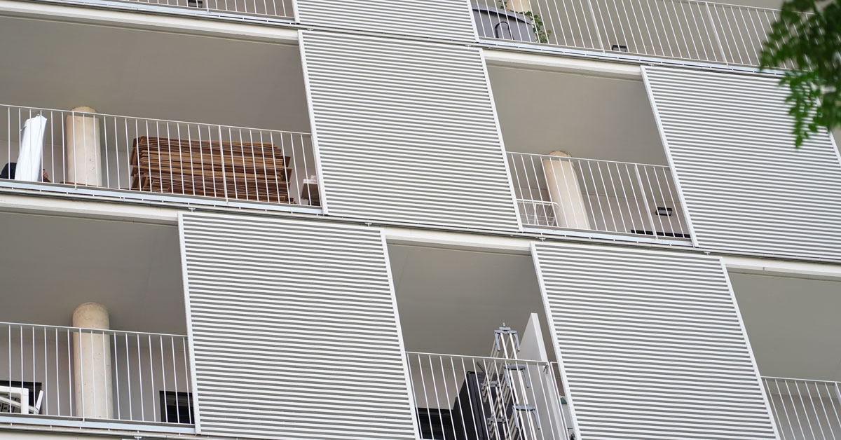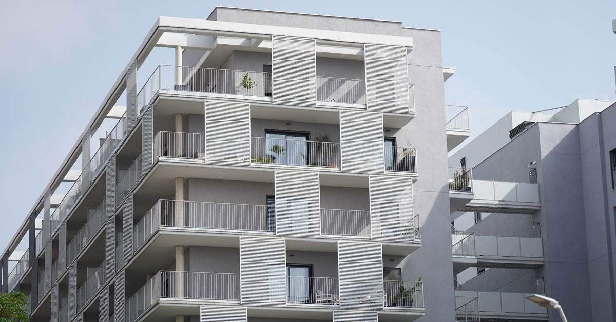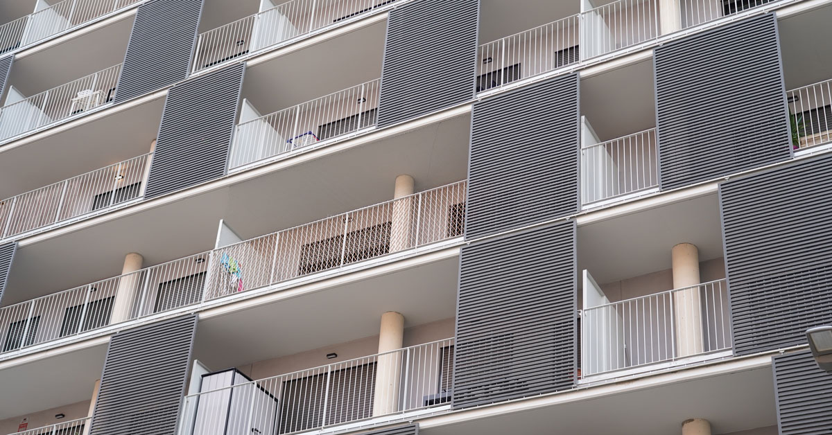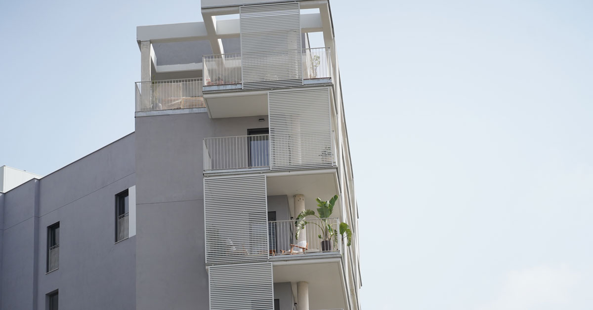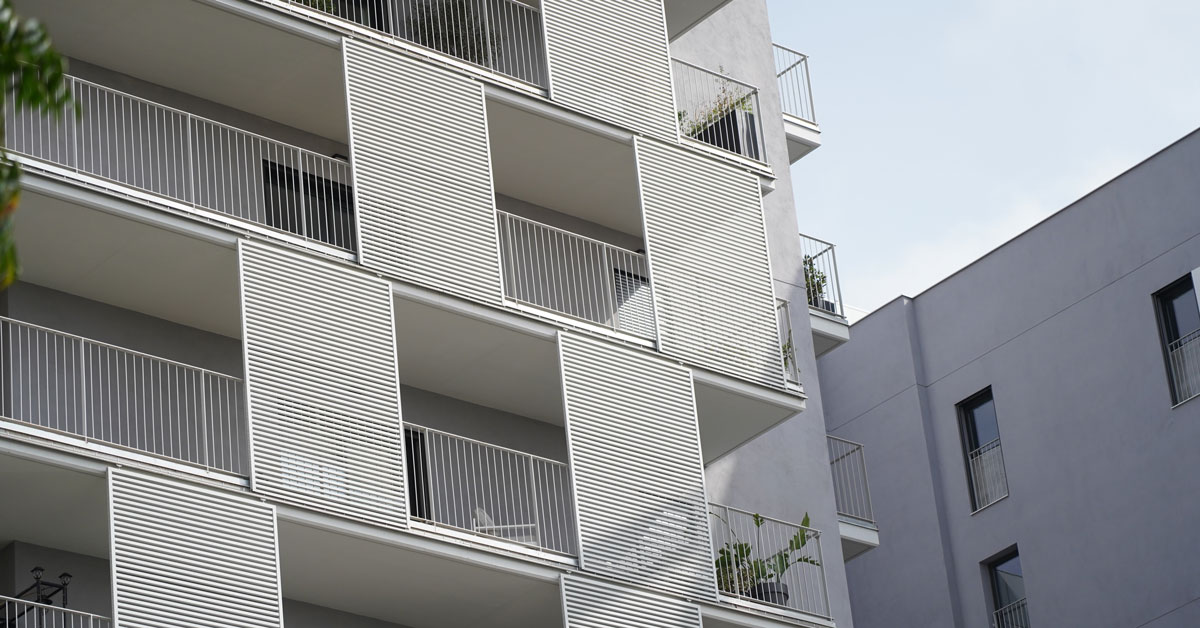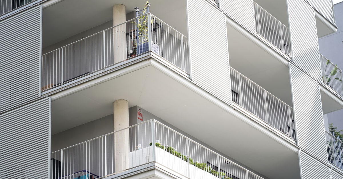 Manufacture and installation of 880 aluminum and glass enclosures, with sliding and practicable hidden leaf openings, with thermal break, for a building of 180 new development homes in the La Sagrera neighborhood, in Barcelona.