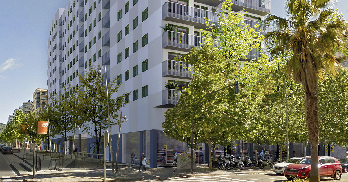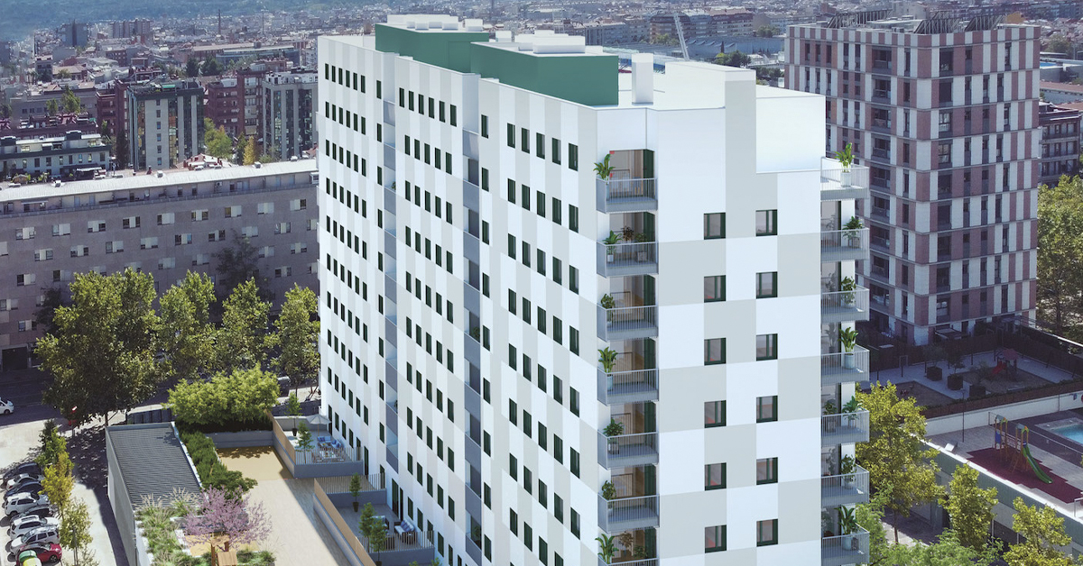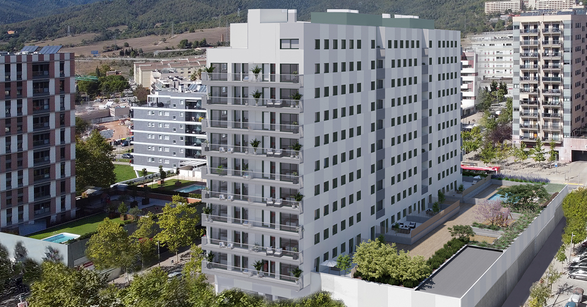 Manufacture and installation of 950 aluminum and glass enclosures, with sliding and practicable hidden leaf openings, with thermal break, for a building of 87 new development homes in Terrassa (Barcelona).