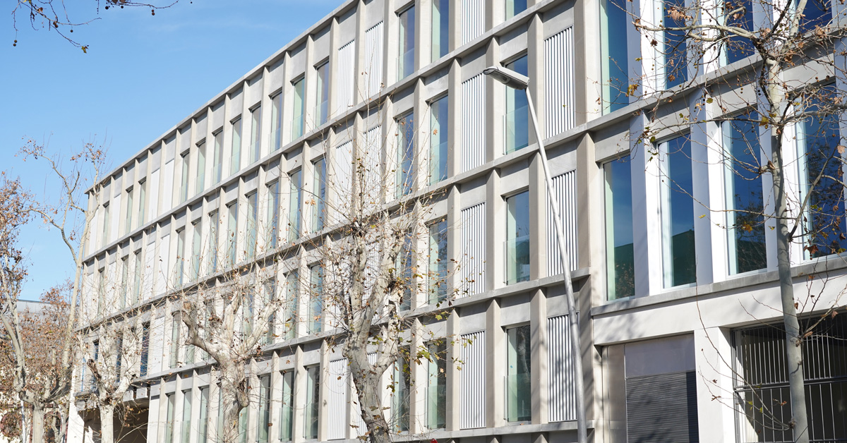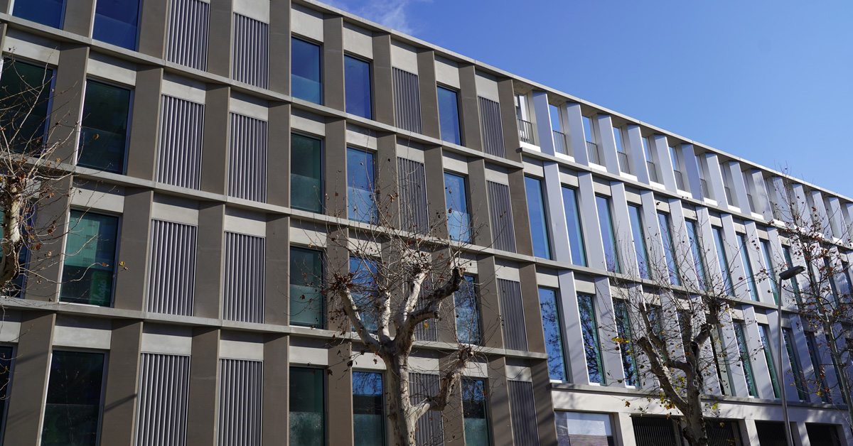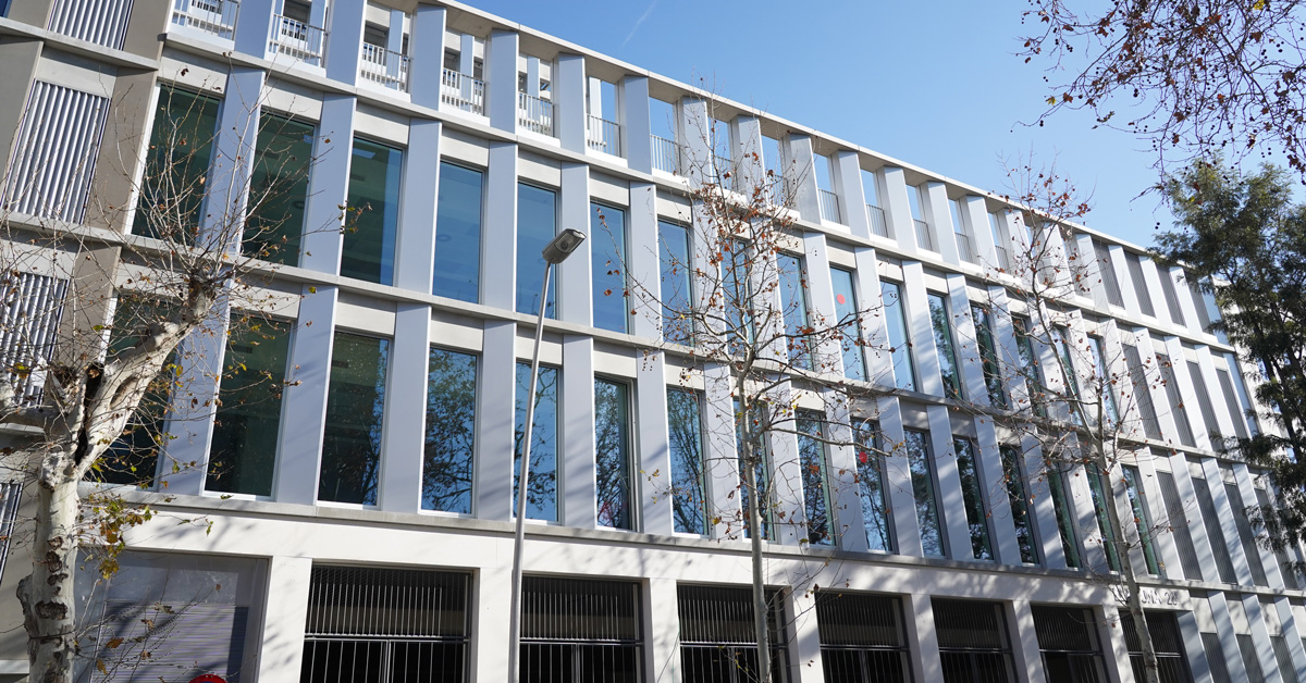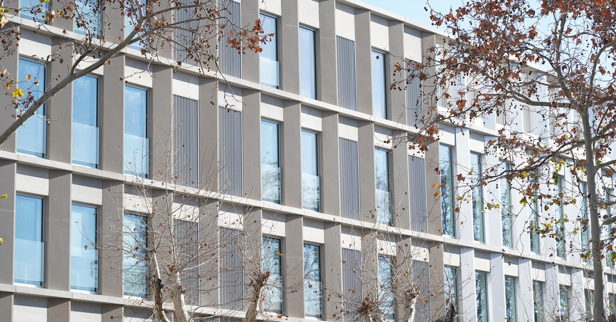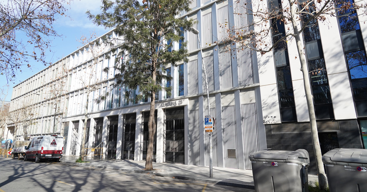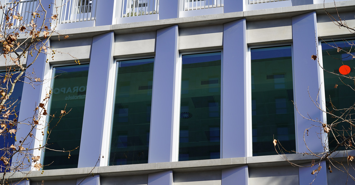 Desarrollo, fabricación e instalación de cerramientos, revestimientos de panel composite y celosías para edificio de oficinas y nueva residencia en la calle Llacuna de Barcelona.