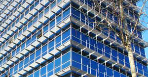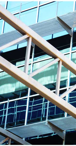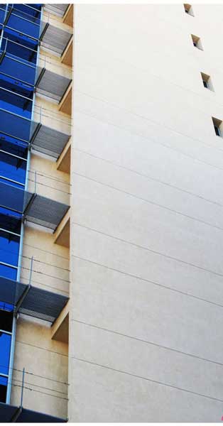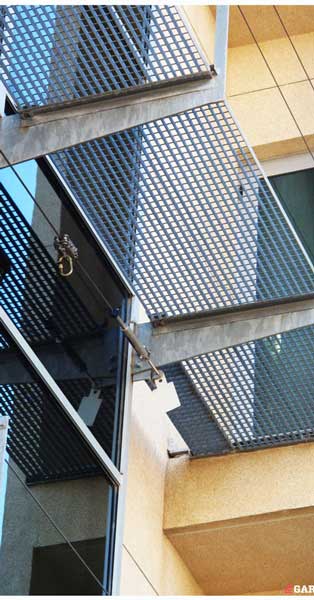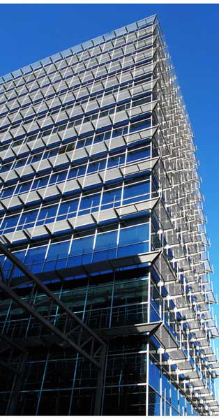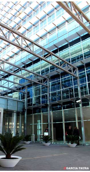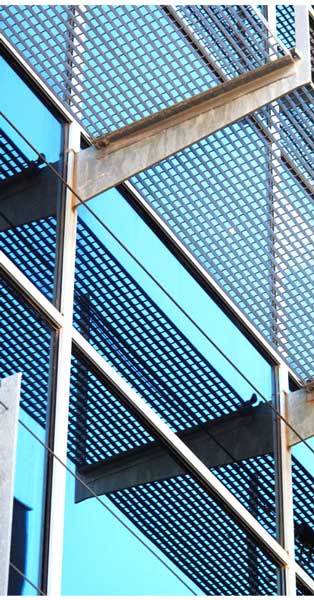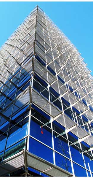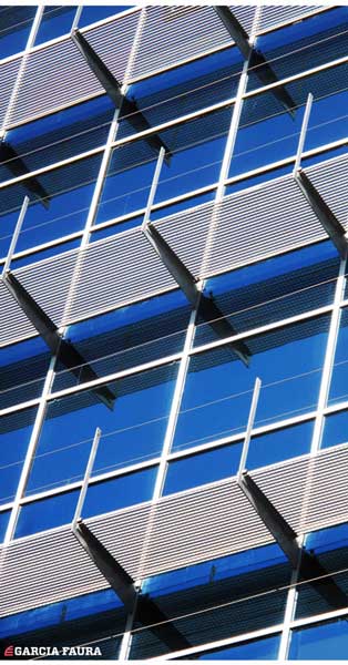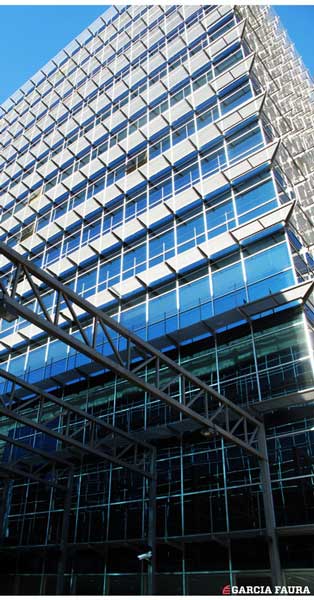 La particularidad de este muro cortina son las pasarelas de religa de hierro galvanizado que lo envuelven. Salen de cada canto de forjado y cubren la función de pasarelas de servicios, però también de sombrilla, dotando al edificio de gran singularidad. La fachada se complementa también con unas cartelas metálicas de acero galvanizado que penetran en el propio muro cortina y que ejercen de sujeción de las pasarelas.