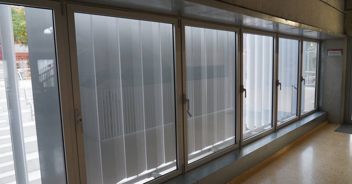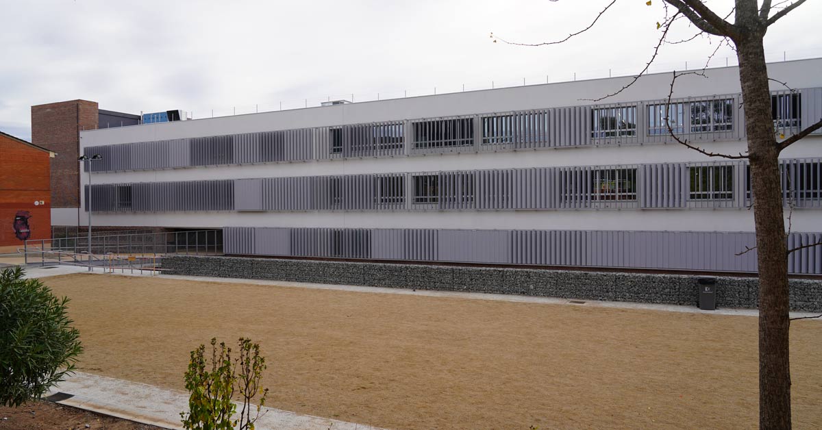 Installation de 288 menuiseries en aluminium et en verre, totalisant près de 750 mètres carrés, avec rupture de pont thermique pour garantir une bonne isolation thermique et acoustique des installations scolaires à Mollet del Vallès (Barcelone).