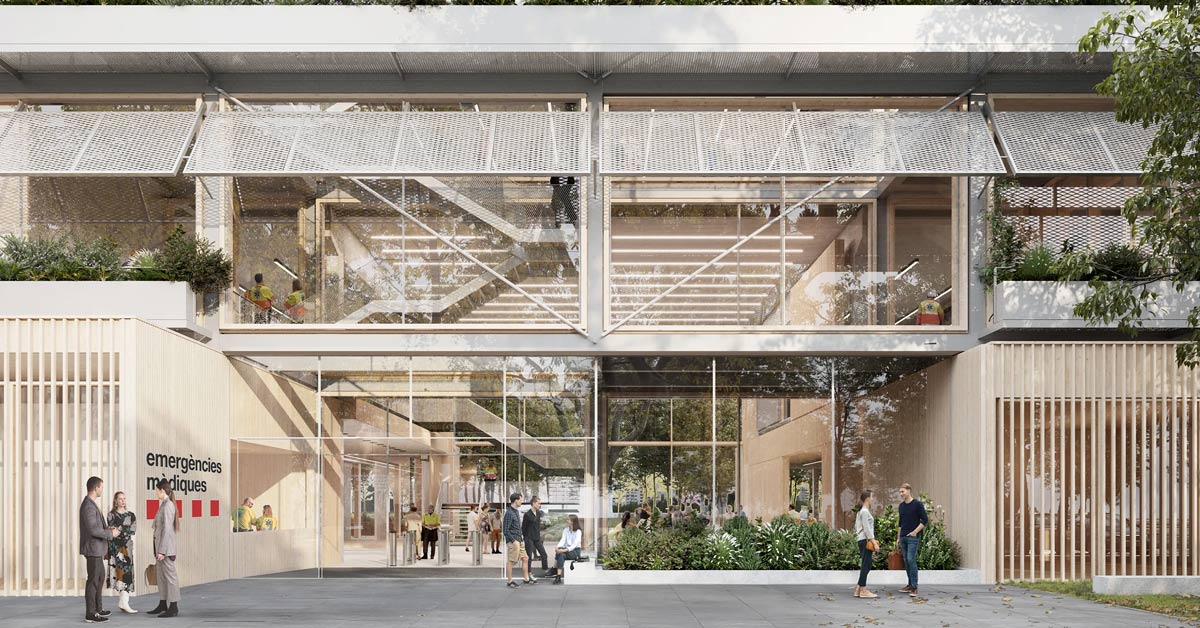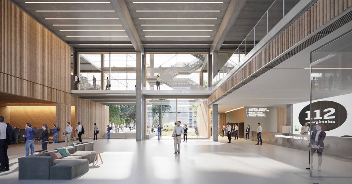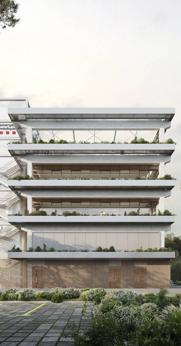 Développement d’un mur-rideau et d’une enveloppe, ainsi que d’un pare-soleil extérieur en maille déployée, pour le nouveau siège du Service d’Urgence Médicale (SEM) à Gran Via de L’Hospitalet de Llobregat (Barcelone). Un projet architectural de b720 Fermín Vázquez arquitectos et AECOM.