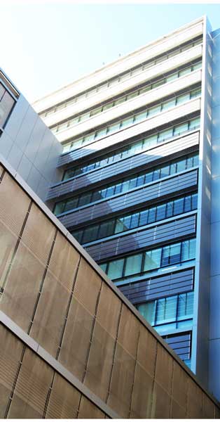 Mur-rideau, protections solaires de structure métallique et verre sérigraphié