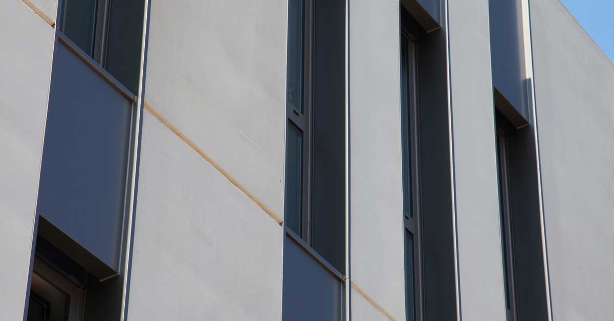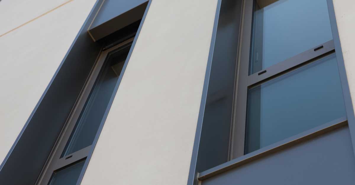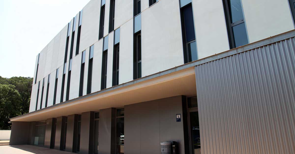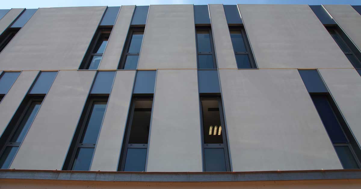 En aquest projecte s’han fabricat i instal·lat tancaments de predomini vertical, de franges estretes ajustades al revestiment de pedra de la façana. Presenten una estètica de visió minimalista degut a la secció estreta de la perfileria, que és de fulla oculta. La forma triangular de l’edifici, a més, ha obligat a un complex folrat de composite en tot el sostre exterior de la façana principal.