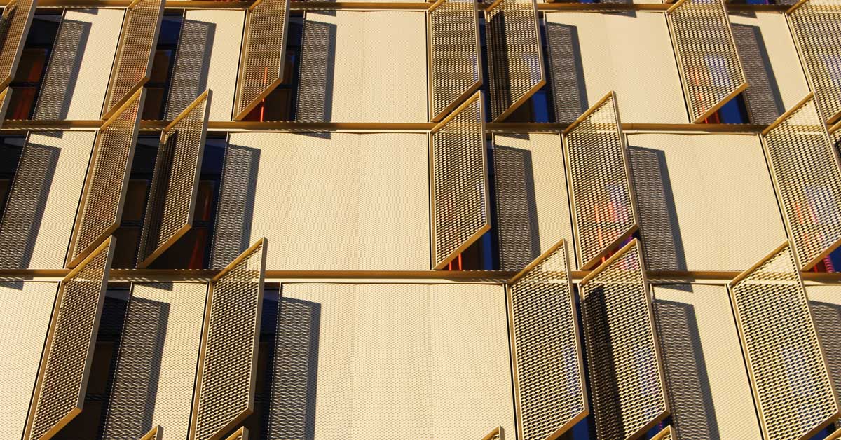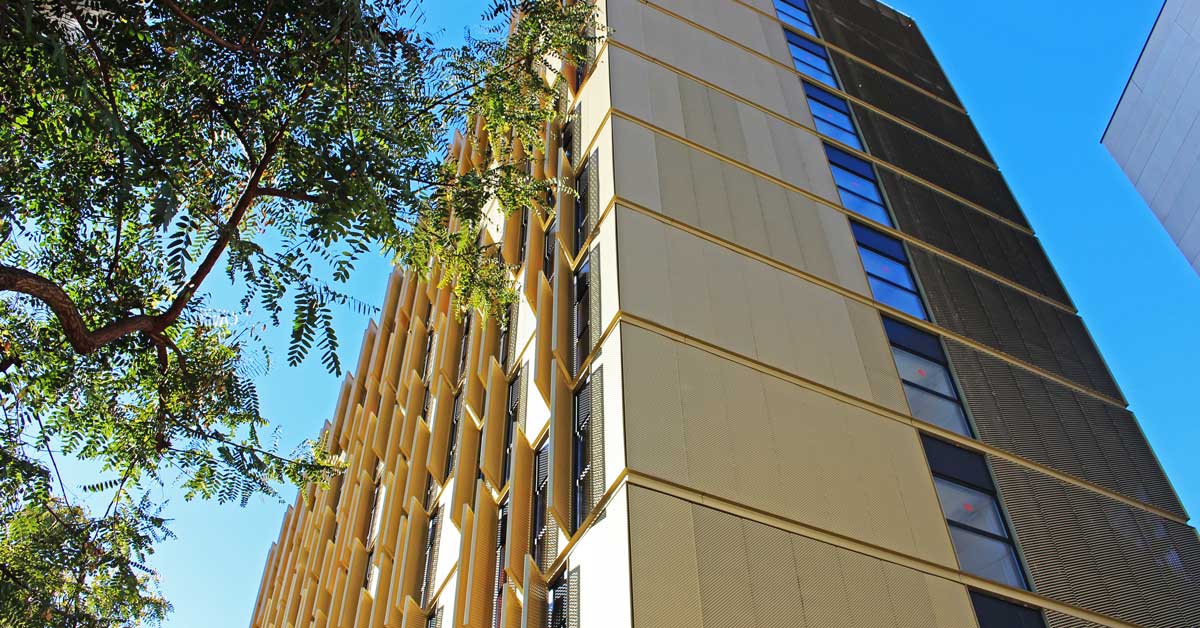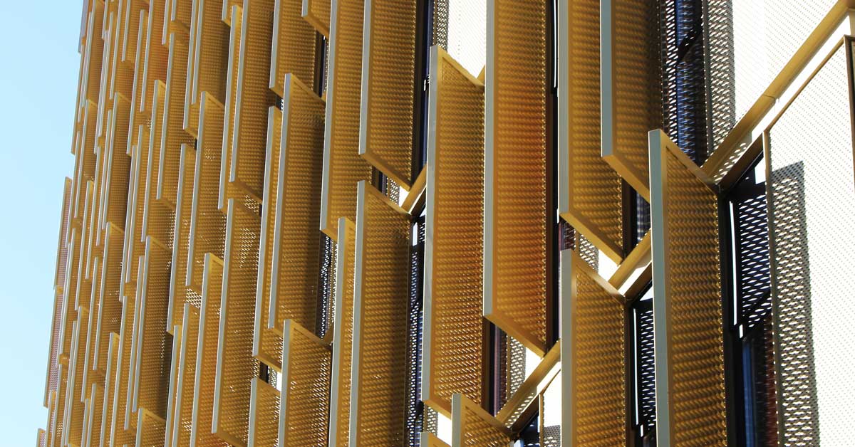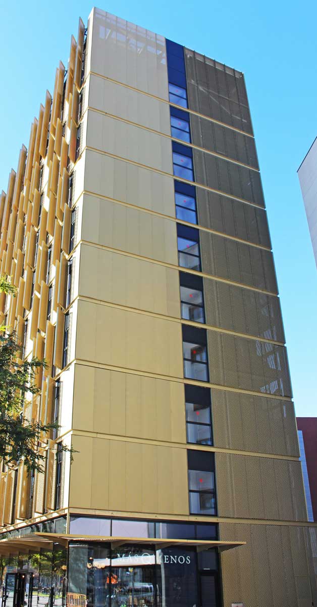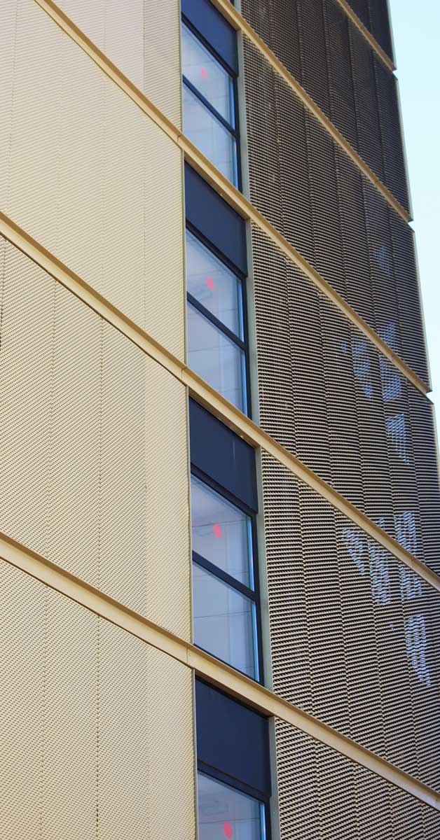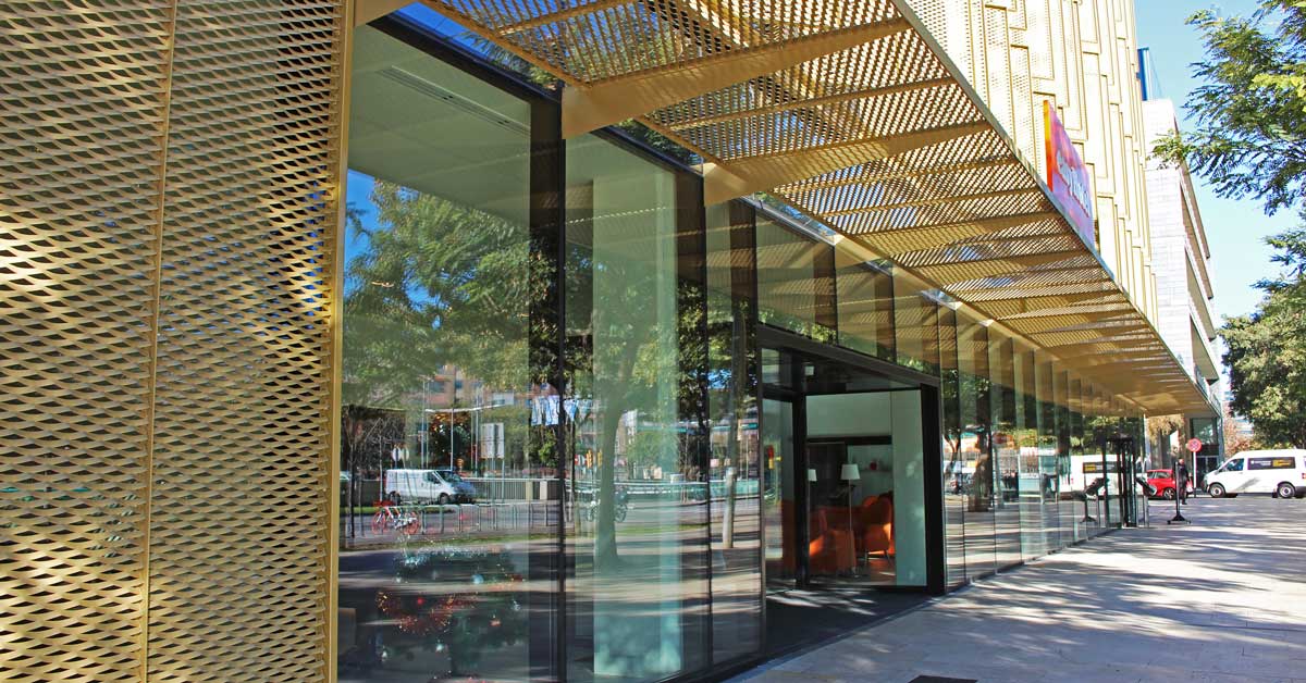 GARCIA FAURA ha fabricat i instal·lat 332 finestres practicables de fulla oculta en acabat anoditzat negre, a més de la instal·lació a l’exterior de panells de ‘deployé’ en acabat daurat i agafats a bigues de tipus UPN perimetrals a cantell de forjat, també en color daurat. Finalment, l’empresa ha executat la marquesina de la planta baixa, també amb panells ‘deployé’ daurats.