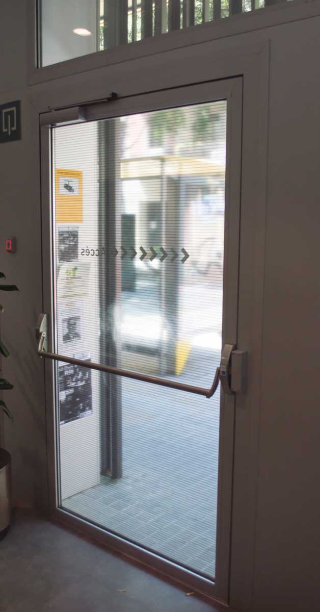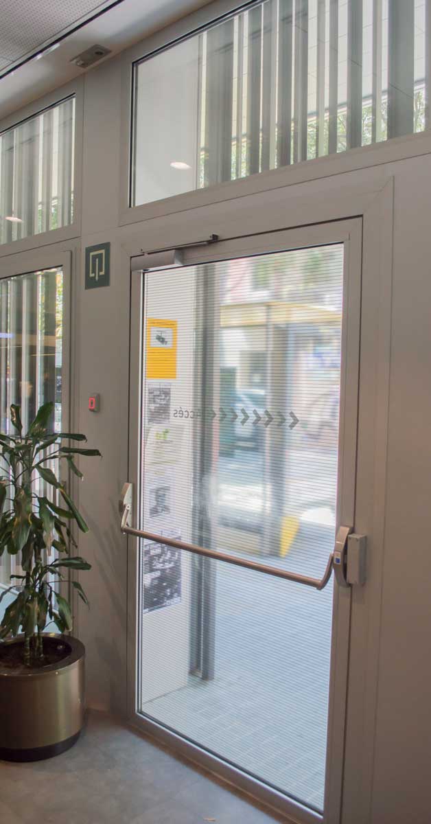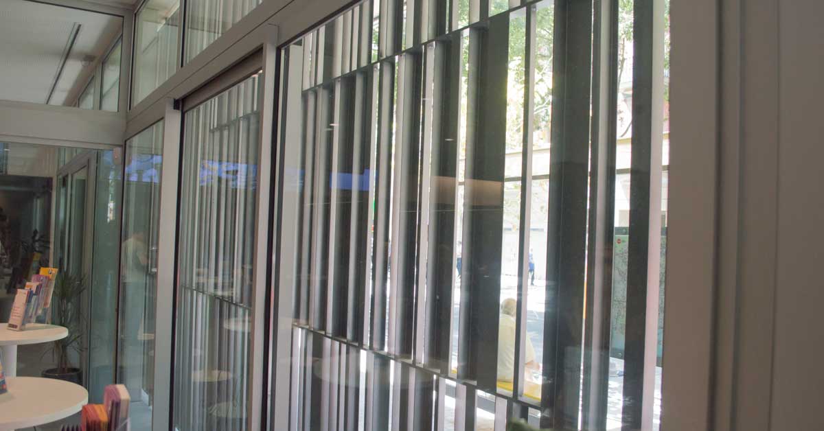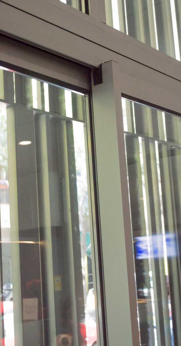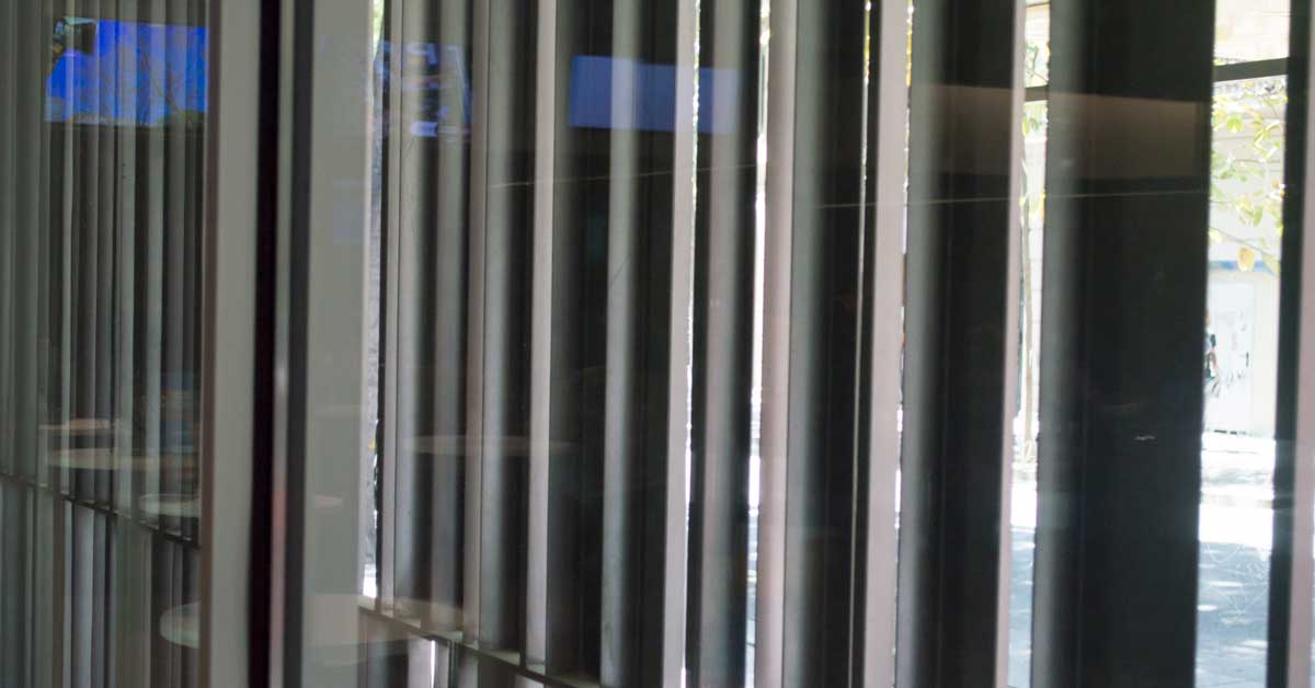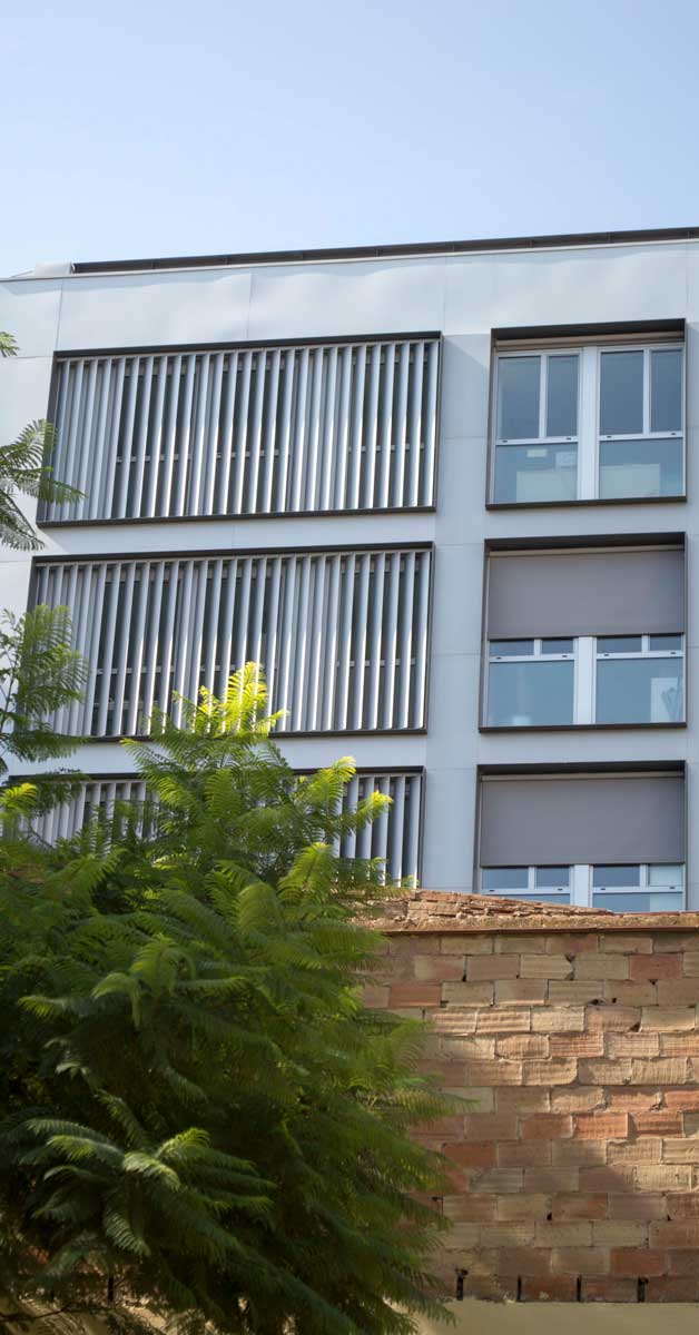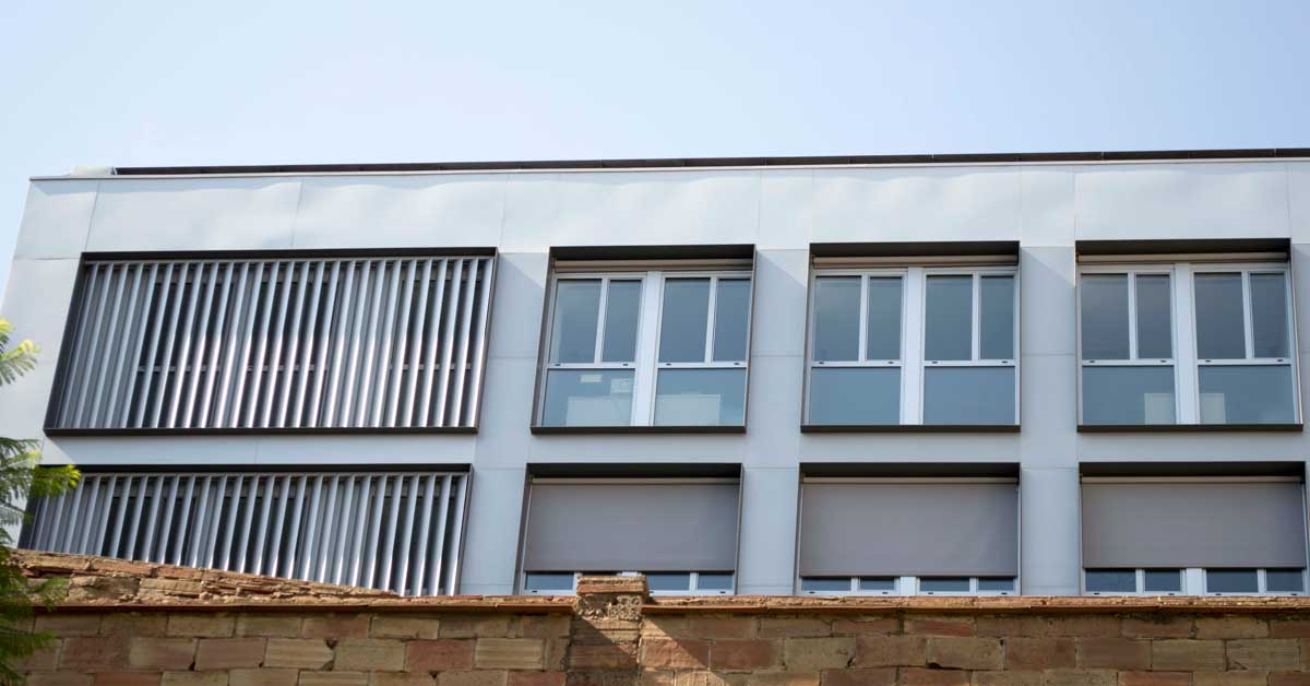 A la façana principal es van instal·lar marcs perimetrals d’alumini extrusionat lacat com a embocadures de les fusteries, juntament amb una marquesina folrada amb panell composite. A la façana posterior, els treballs de GARCIA FAURA també van consistir en la instal·lació d’aquests mateixos marcs perimetrals, però a més es va folrar tota la façana amb xapa anoditzada plata sobre una subestructura d’acer galvanitzat. Finalment també es va realitzar una tercera façana amb safates de xapa anoditzada i aïllant encolat, cargolades sobre una estructura d’acer galvanitzat.