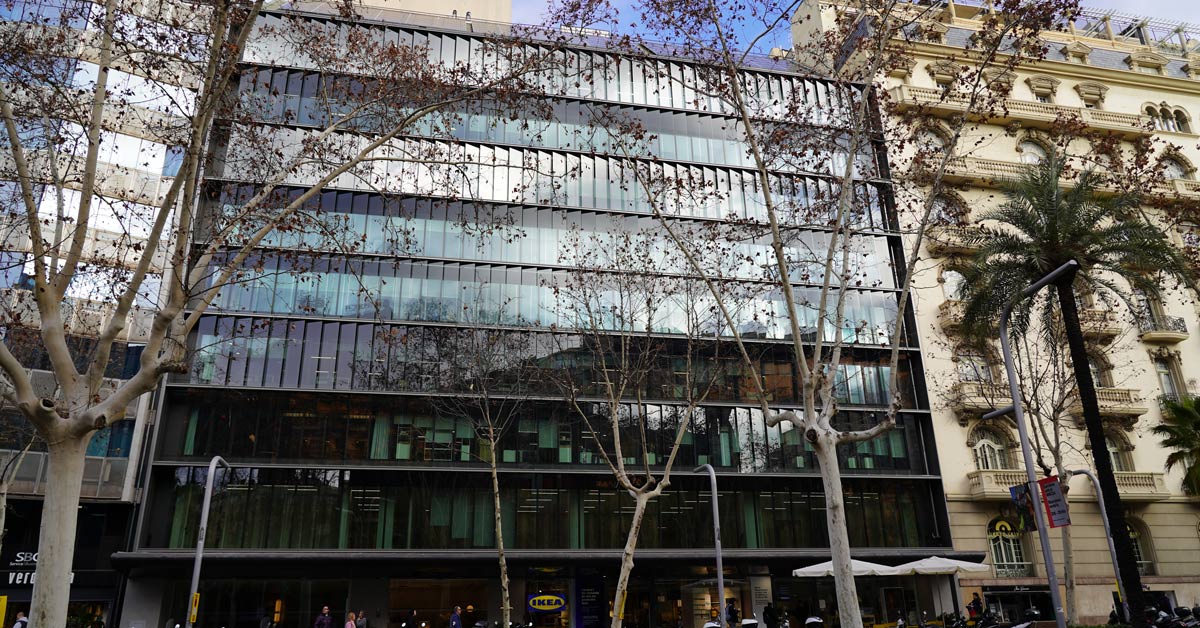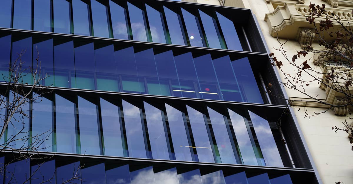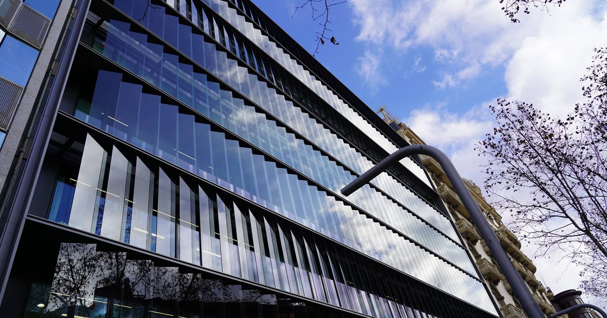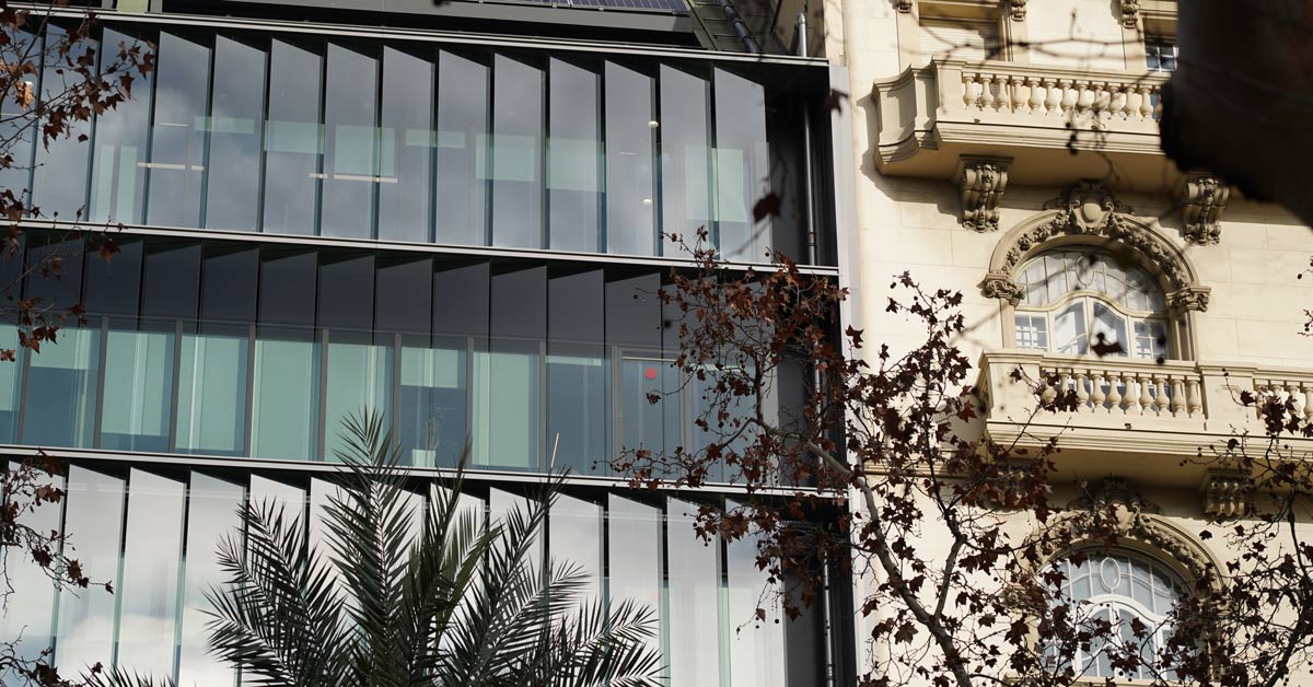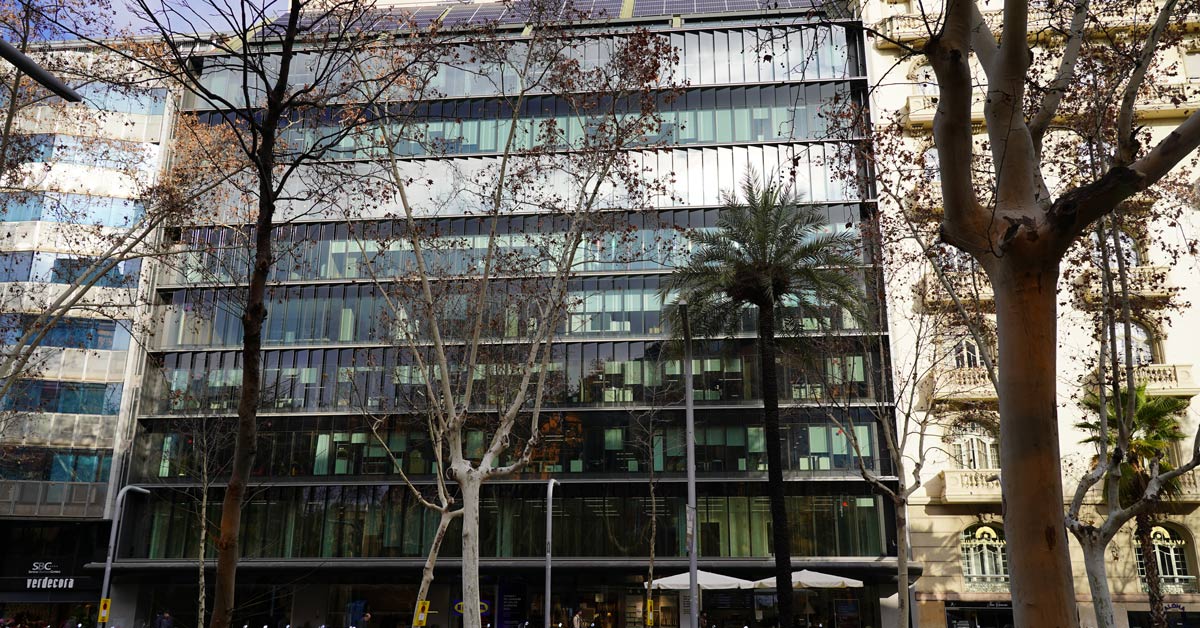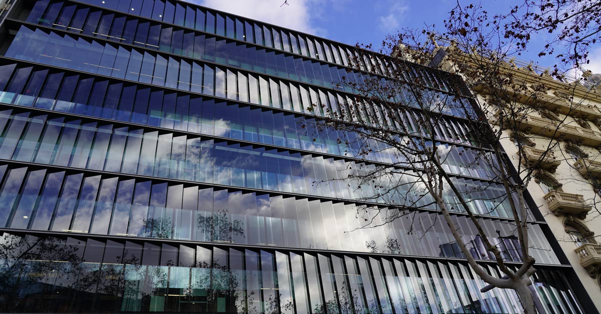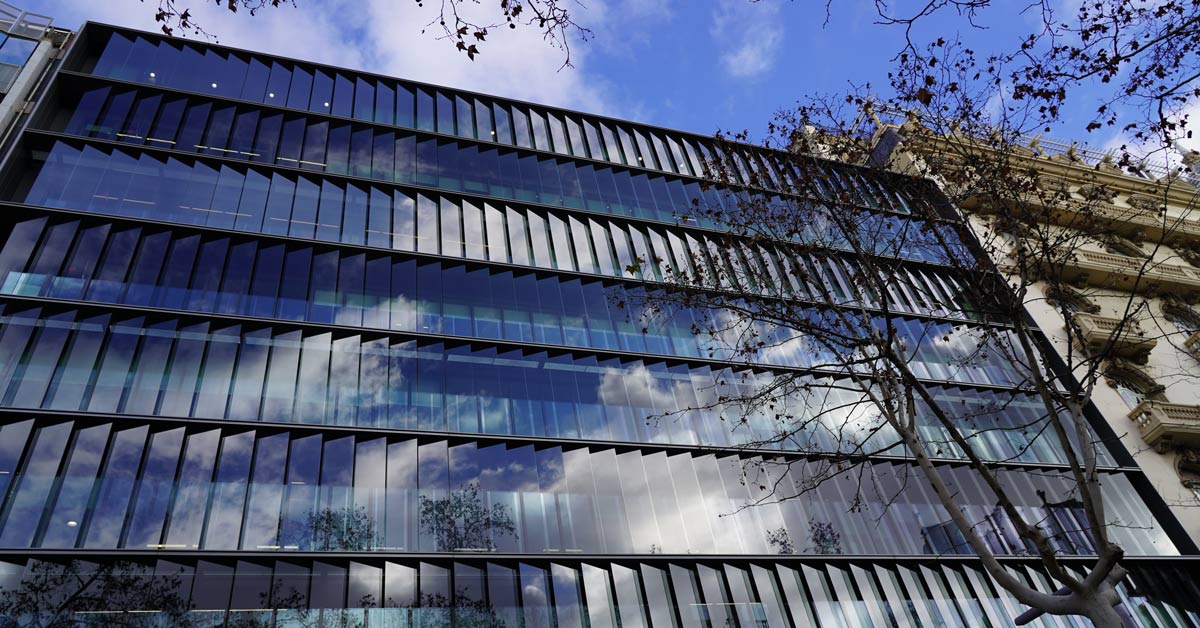 Desenvolupament de façana, doble pell, tancaments d’alumini i vidre fa per a la rehabilitació d’aquest edifici d’oficines a Barcelona.