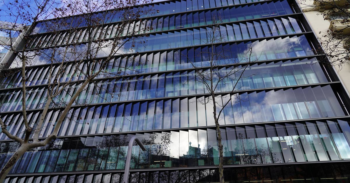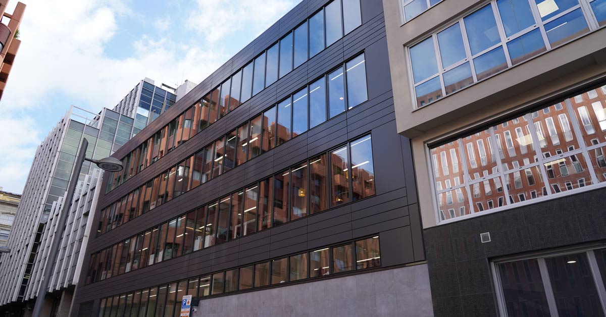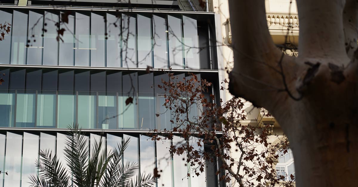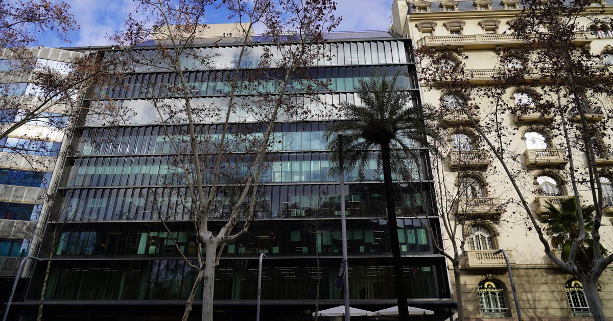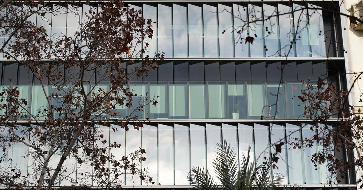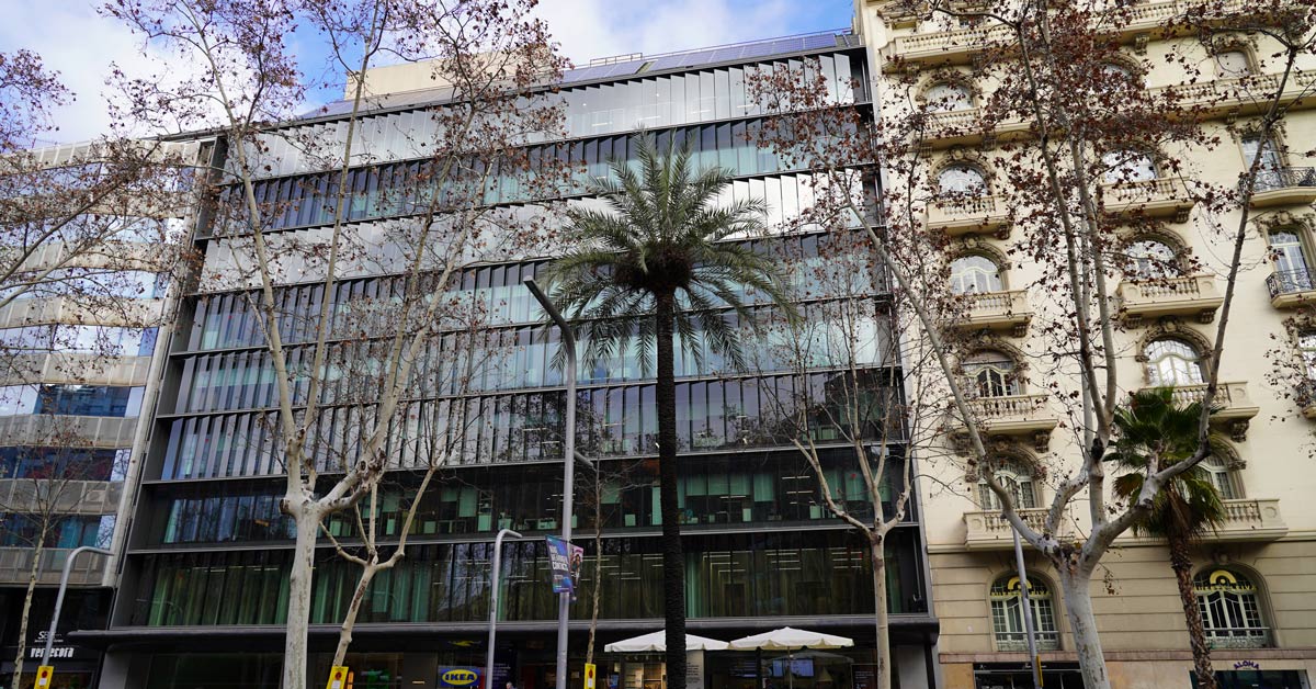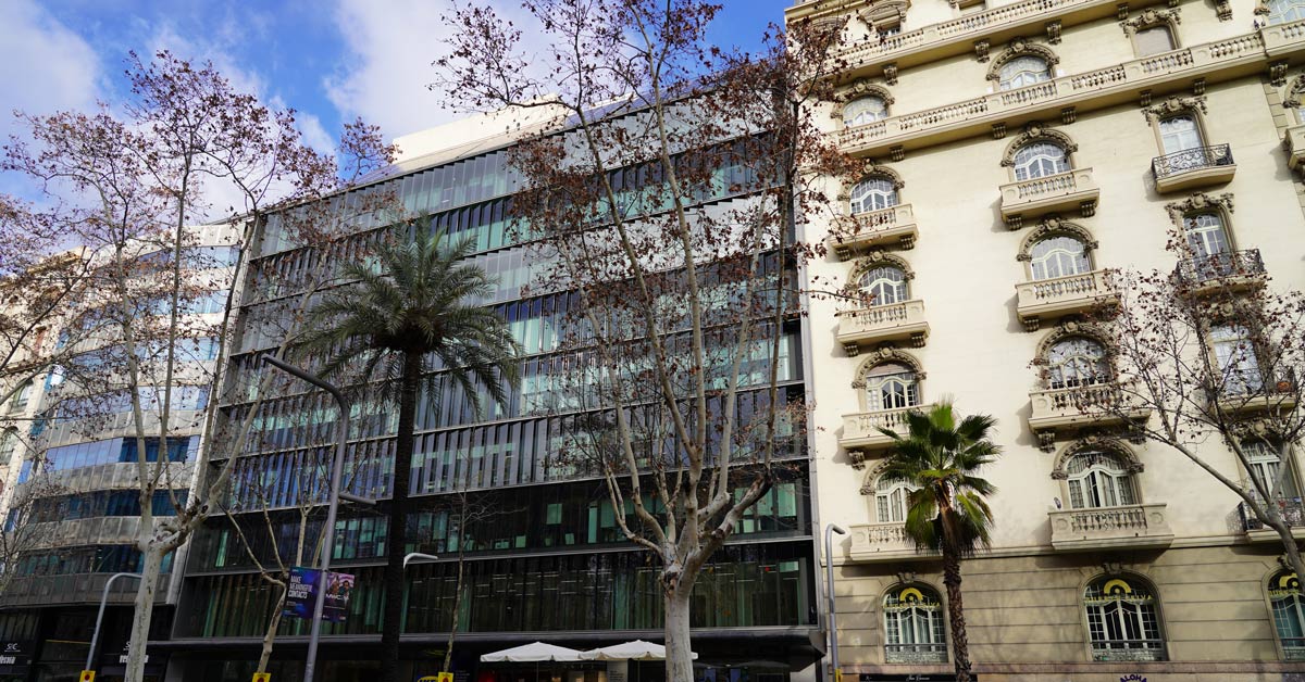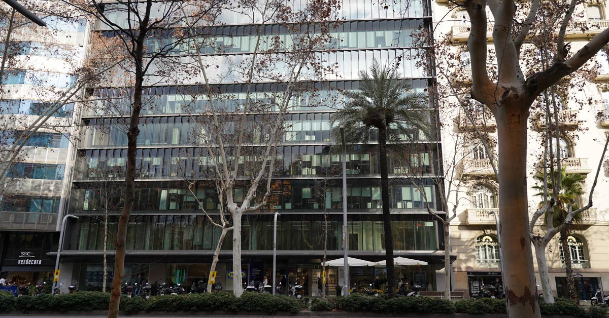 Desenvolupament de façana, doble pell, tancaments d’alumini i vidre fa per a la rehabilitació d’aquest edifici d’oficines a Barcelona.