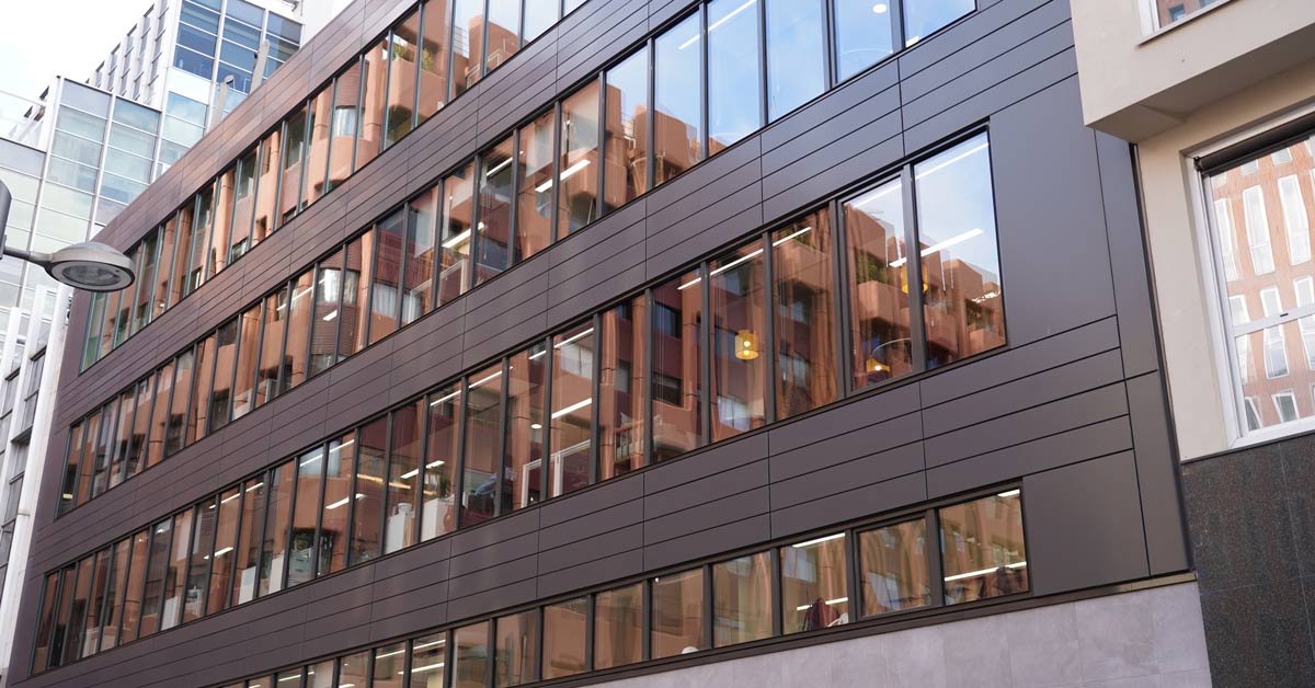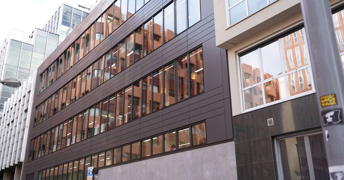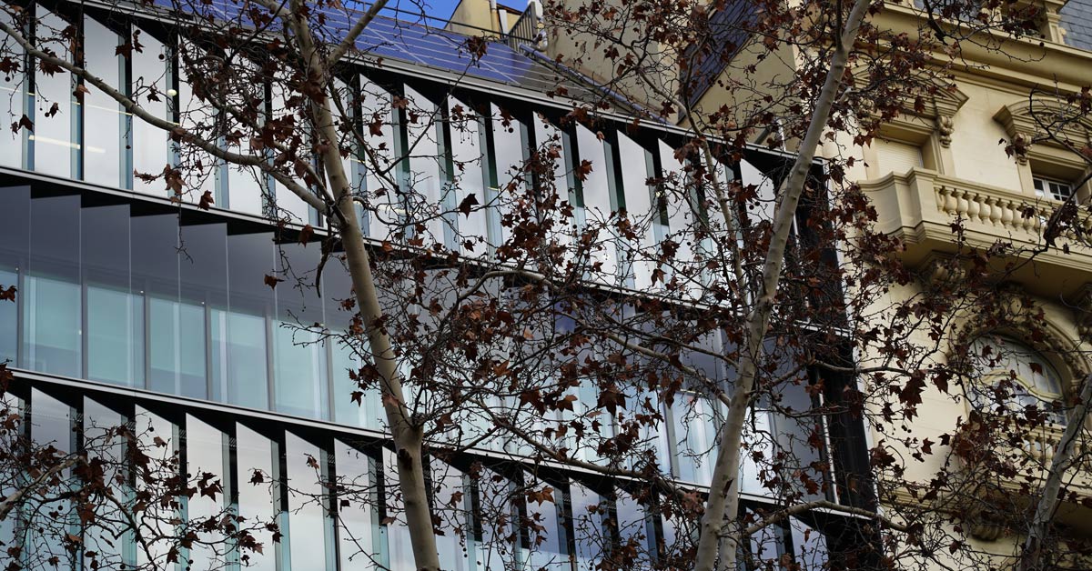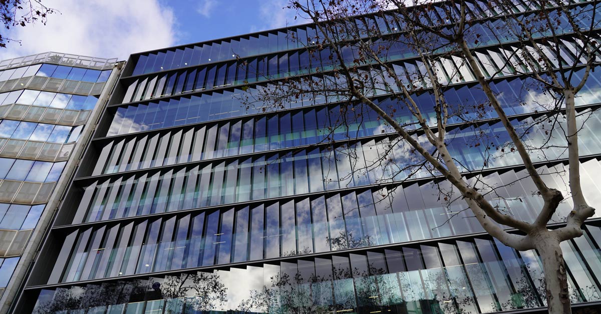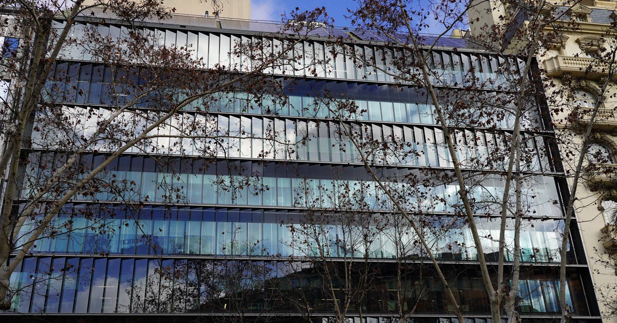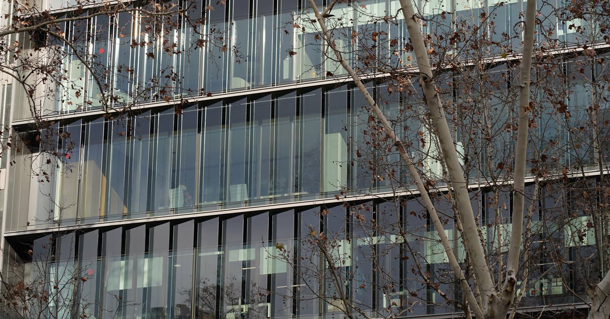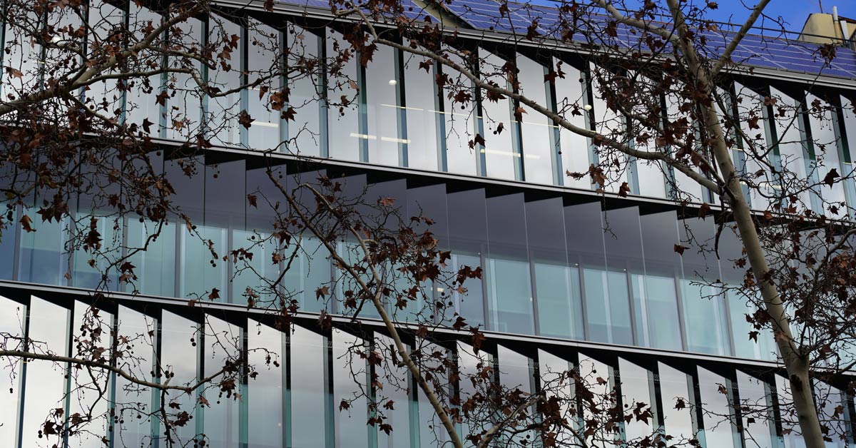 Desenvolupament de façana, doble pell, tancaments d’alumini i vidre fa per a la rehabilitació d’aquest edifici d’oficines a Barcelona.