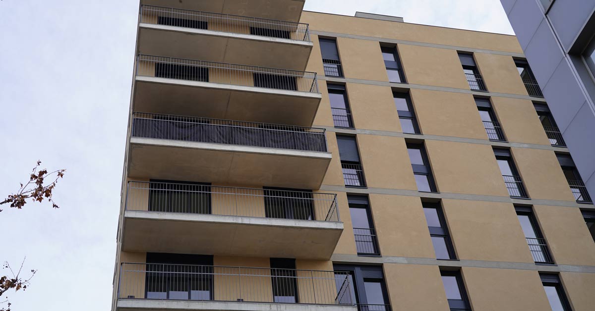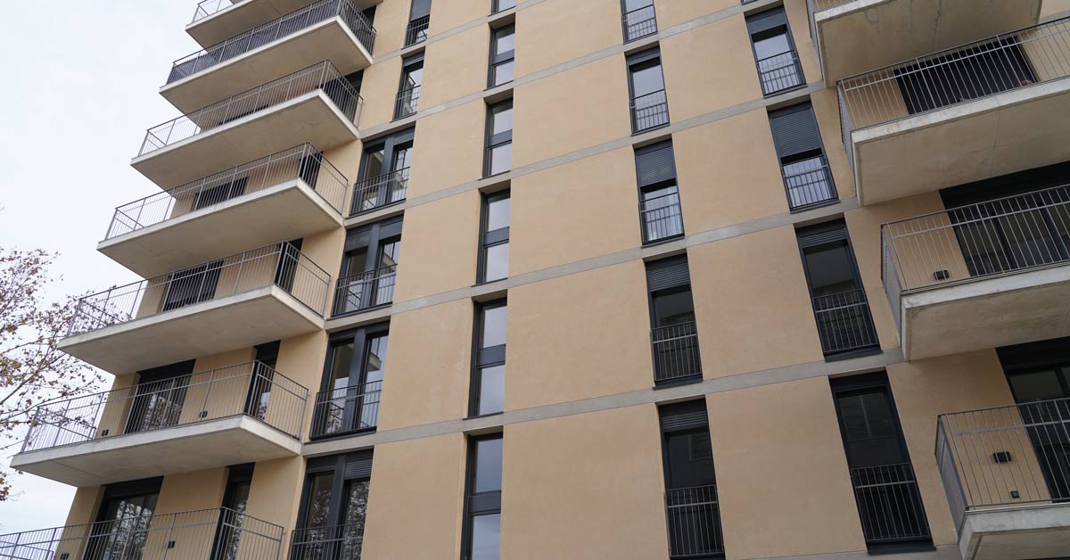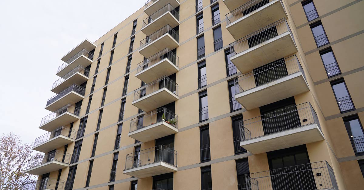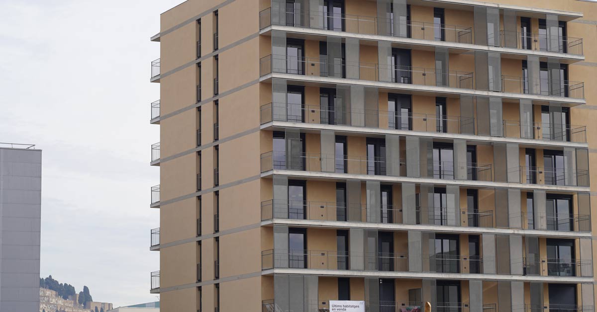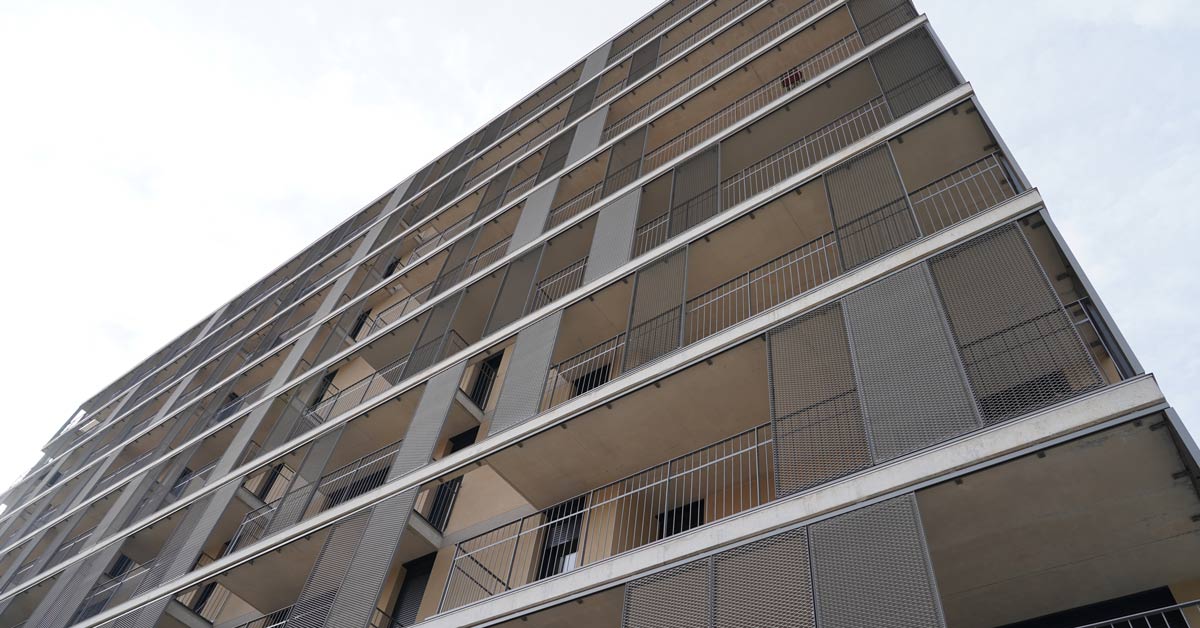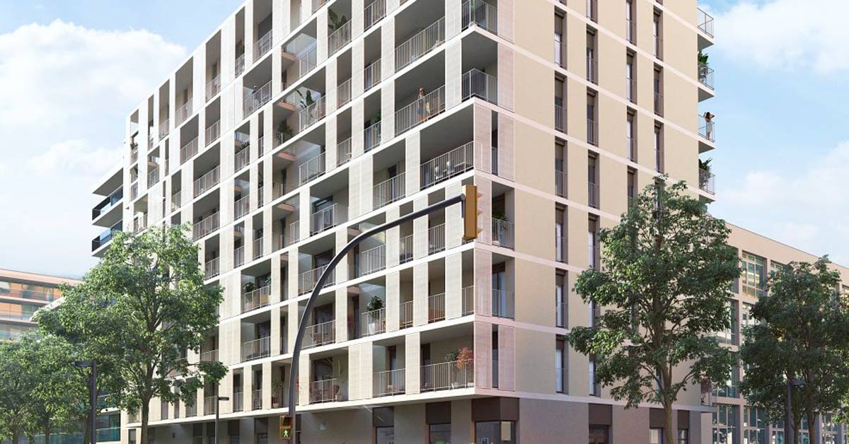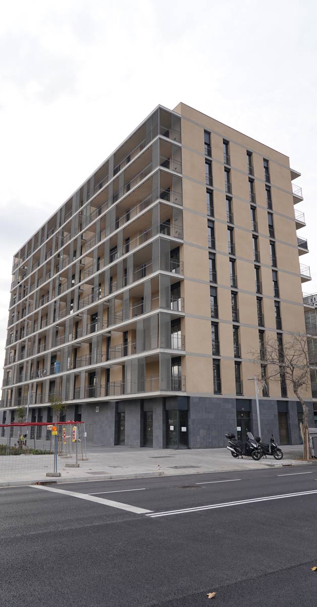Tancaments d’alumini i vidrieria per als edificis Berlín i Lisboa de la promoció d’habitatge Illa A del barri de la Marina del Prat Vermell, a Barcelona.