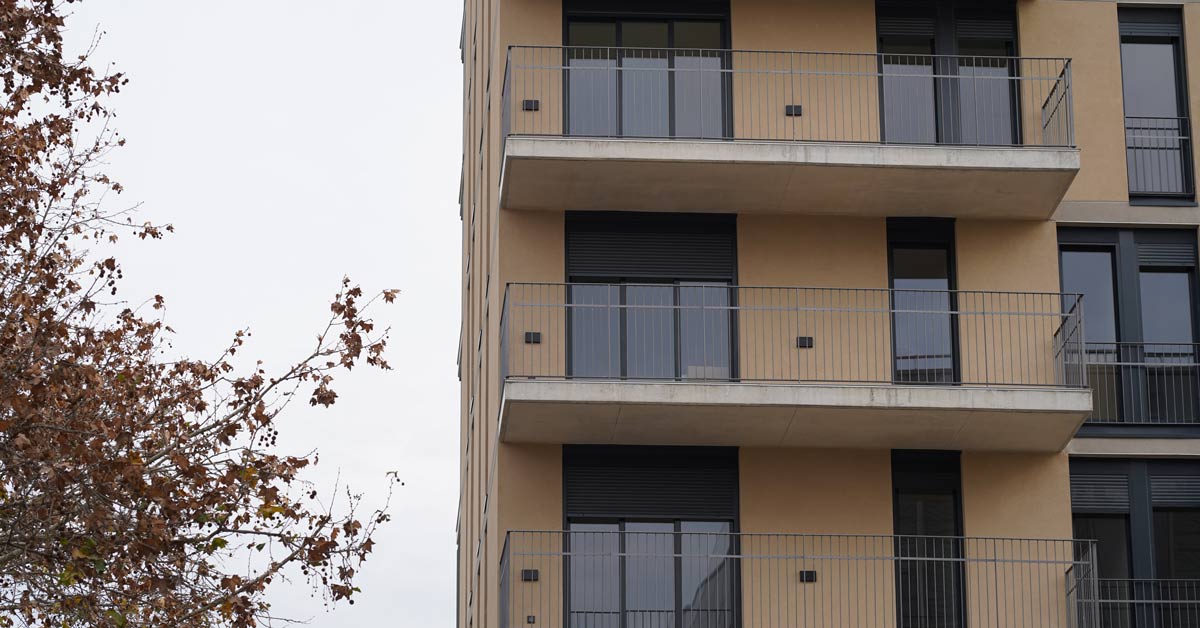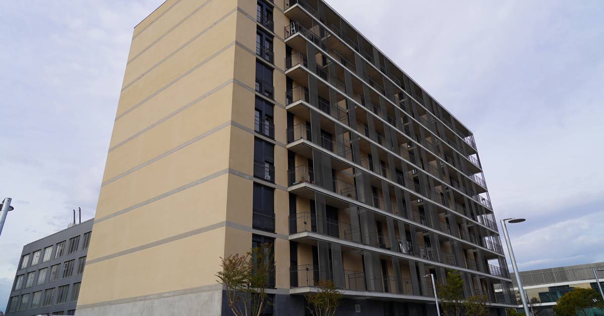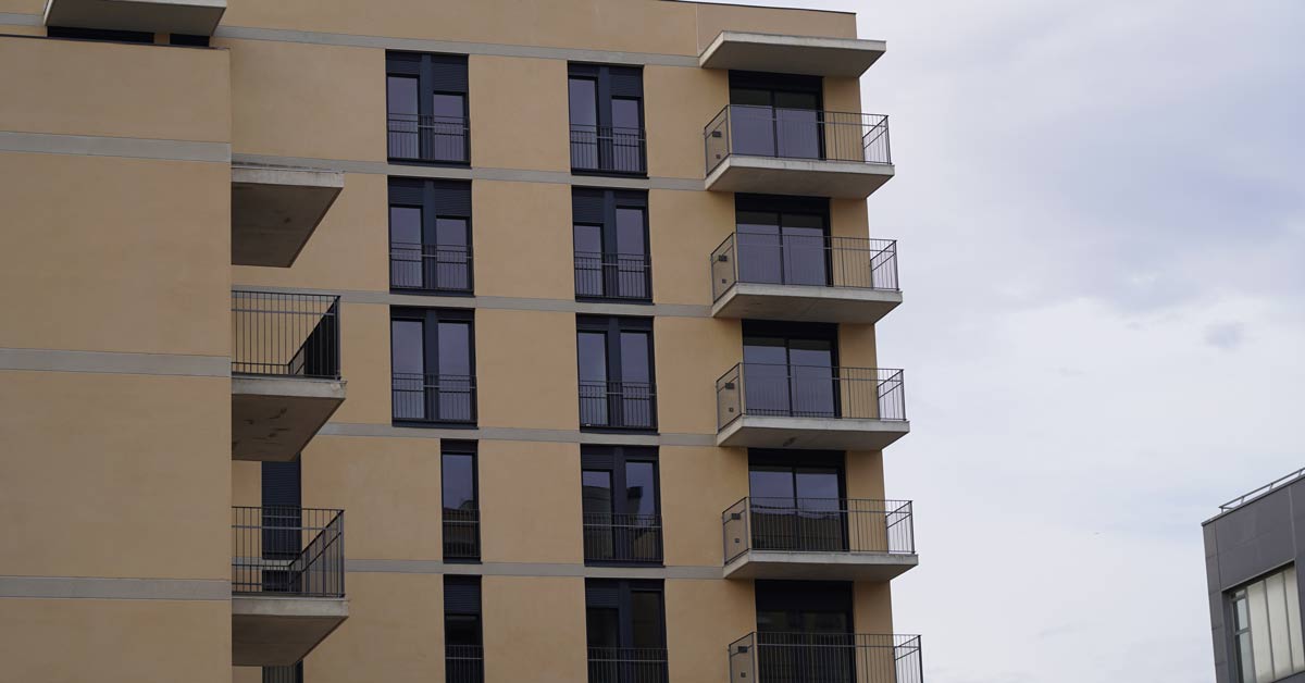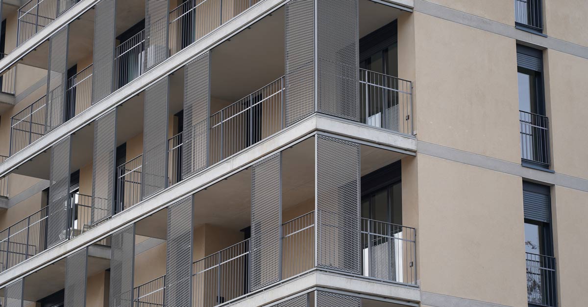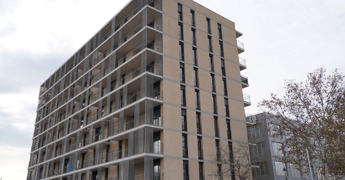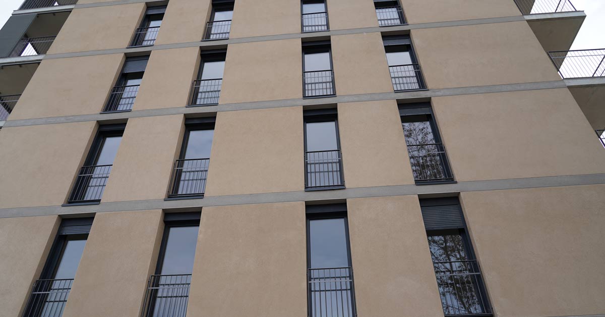 Tancaments d’alumini i vidrieria per als edificis Berlín i Lisboa de la promoció d’habitatge Illa A del barri de la Marina del Prat Vermell, a Barcelona.