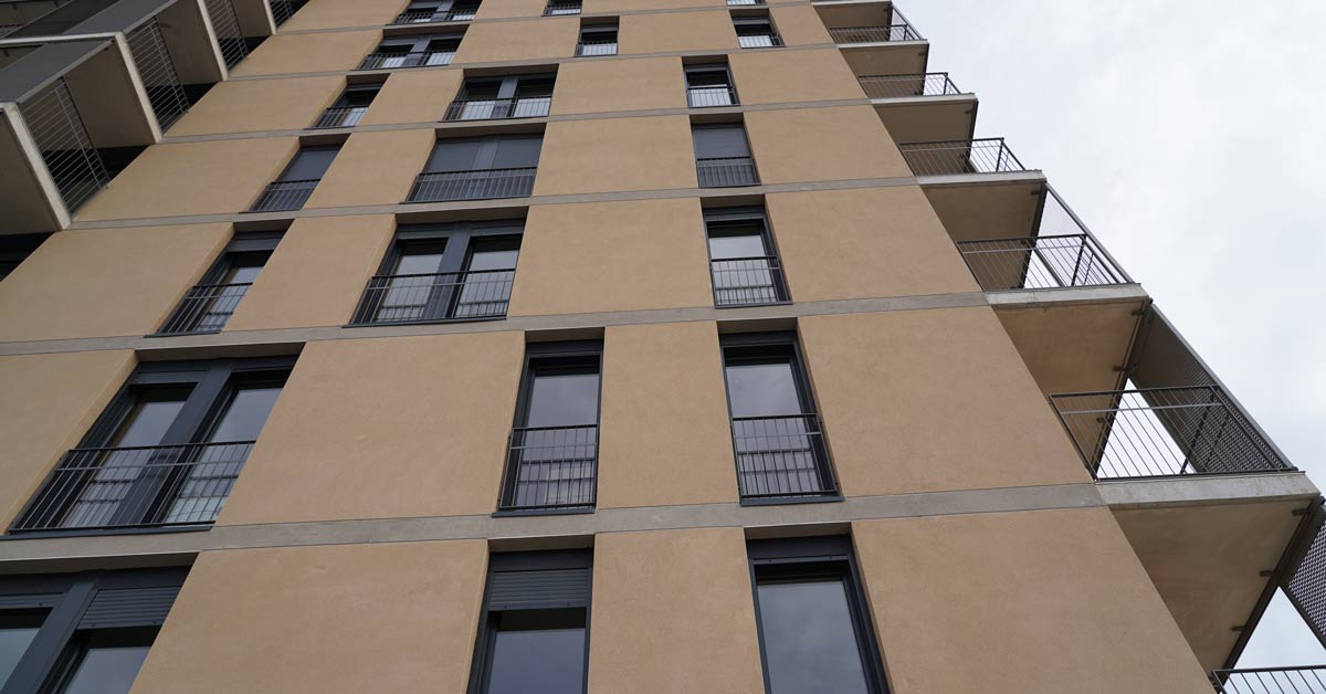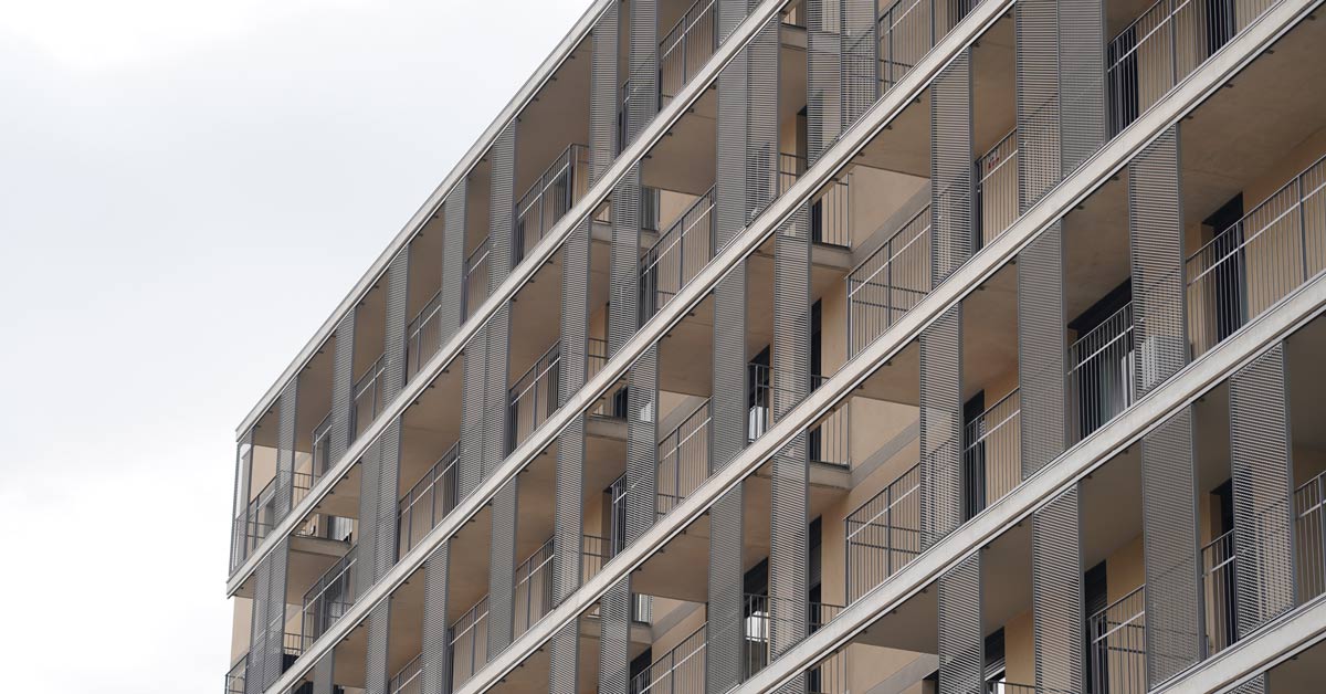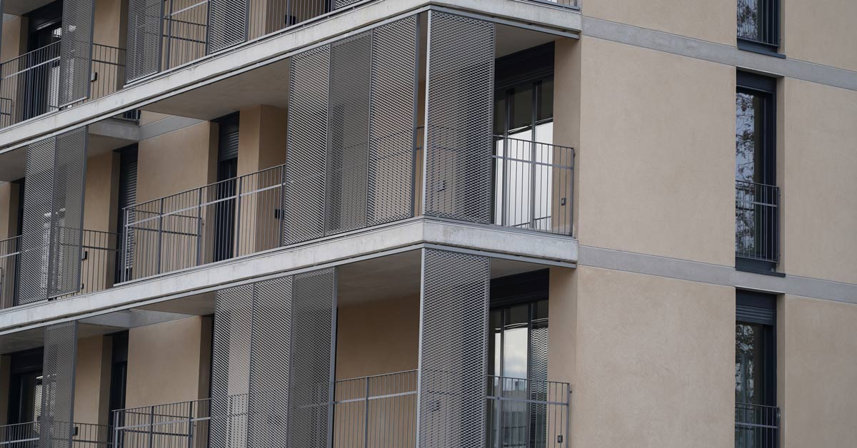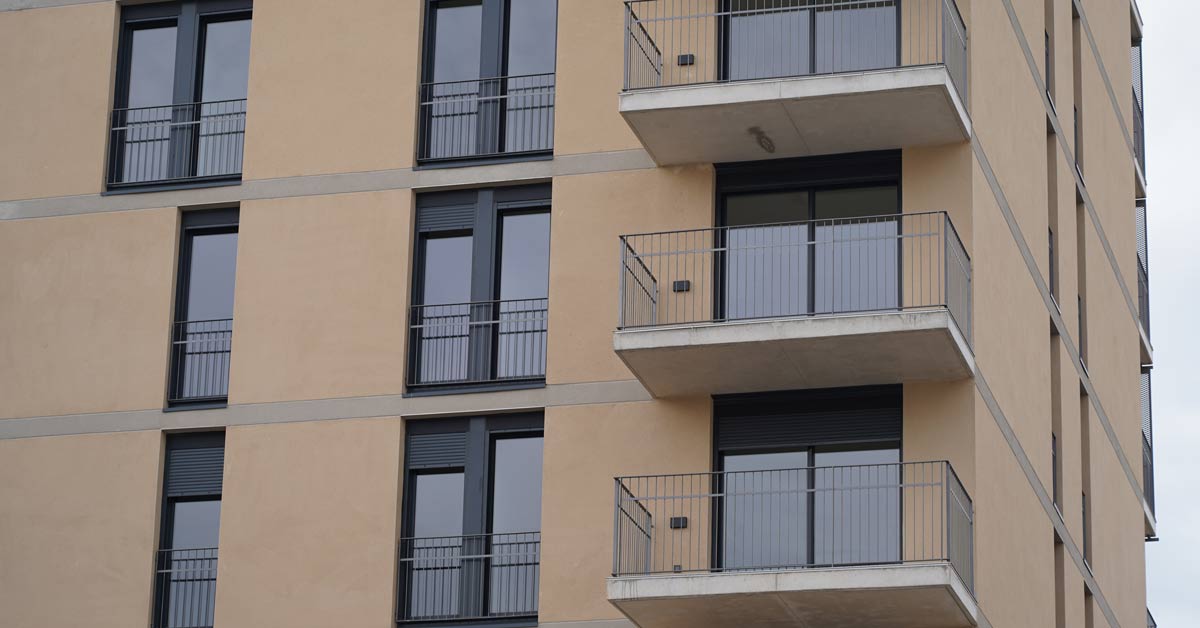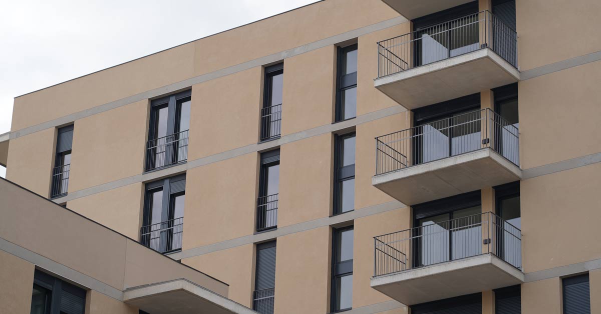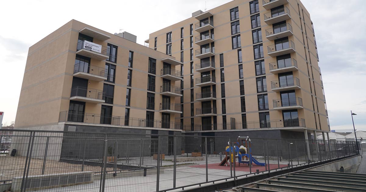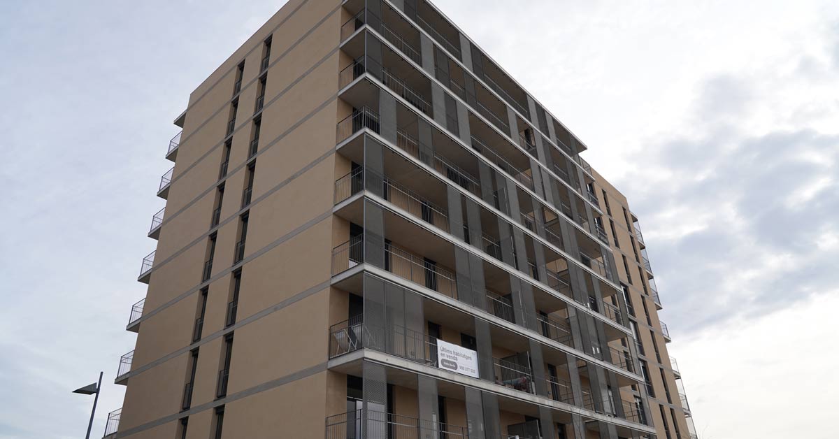 Tancaments d’alumini i vidrieria per als edificis Berlín i Lisboa de la promoció d’habitatge Illa A del barri de la Marina del Prat Vermell, a Barcelona.