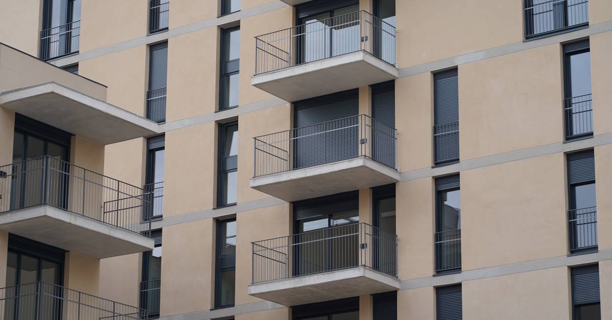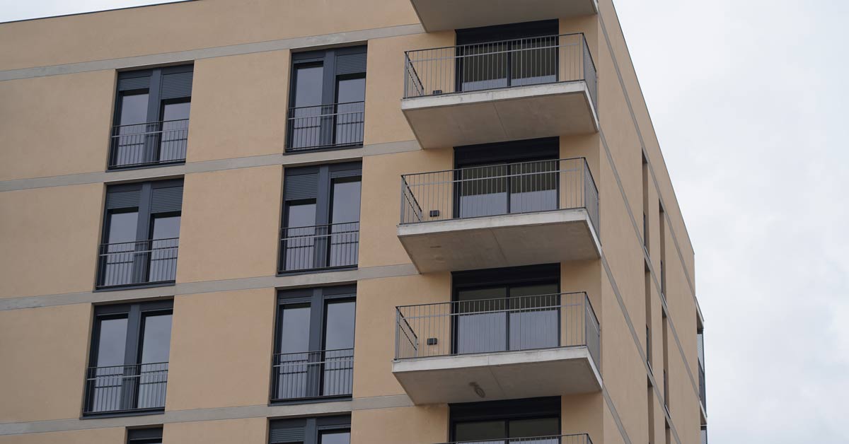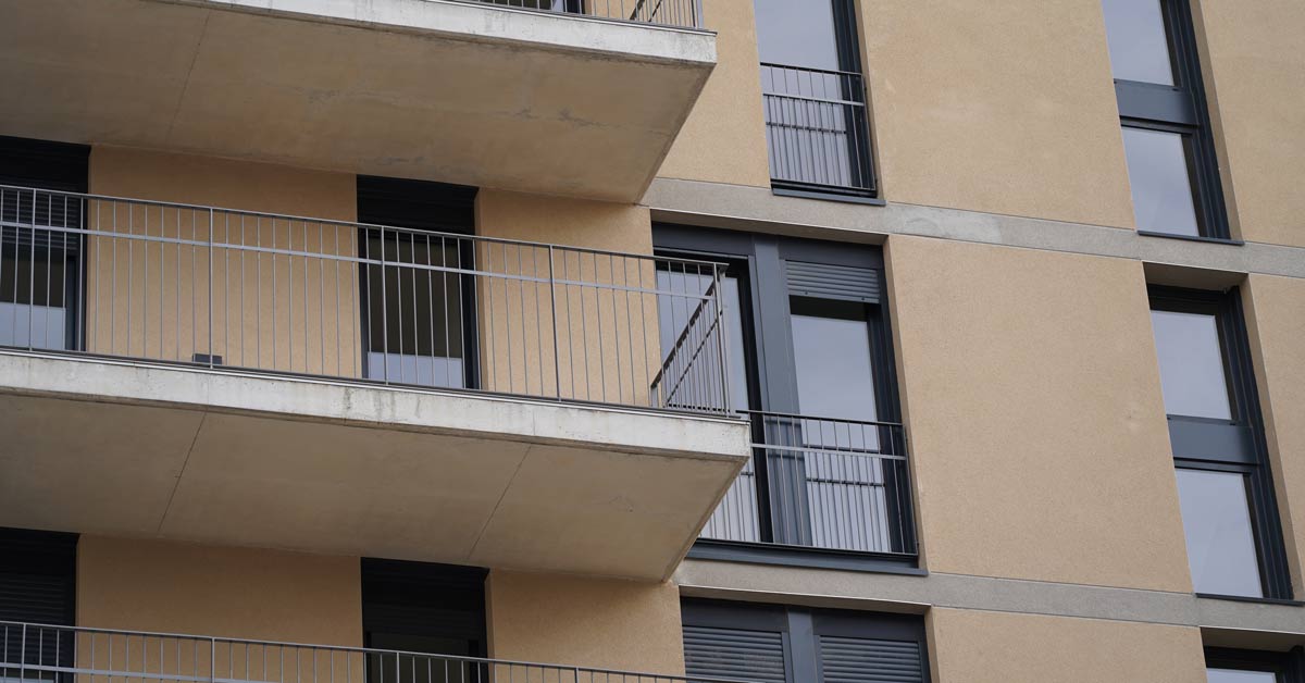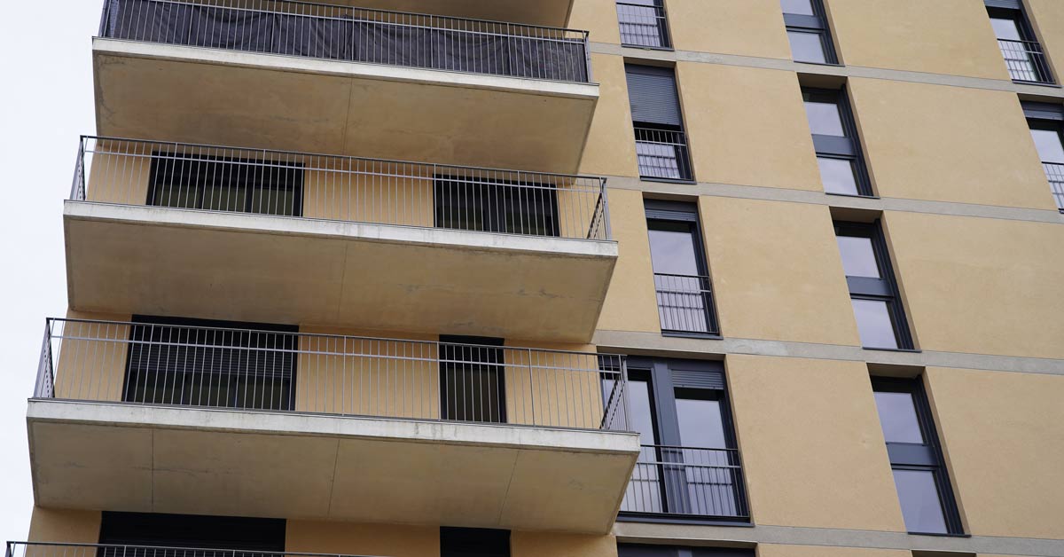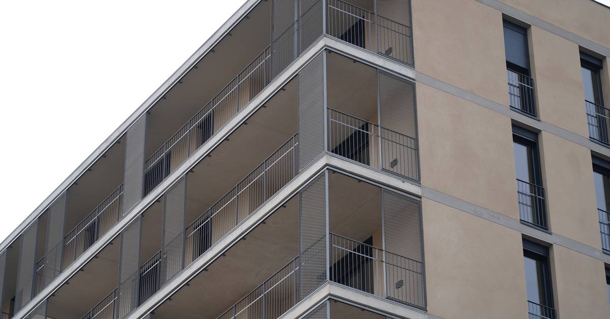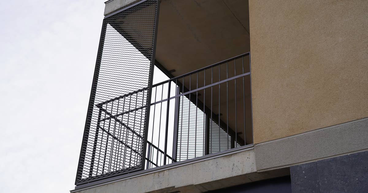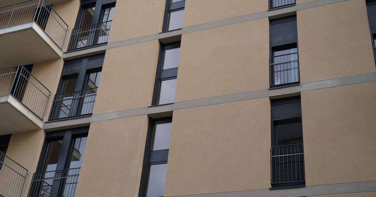 Tancaments d’alumini i vidrieria per als edificis Berlín i Lisboa de la promoció d’habitatge Illa A del barri de la Marina del Prat Vermell, a Barcelona.