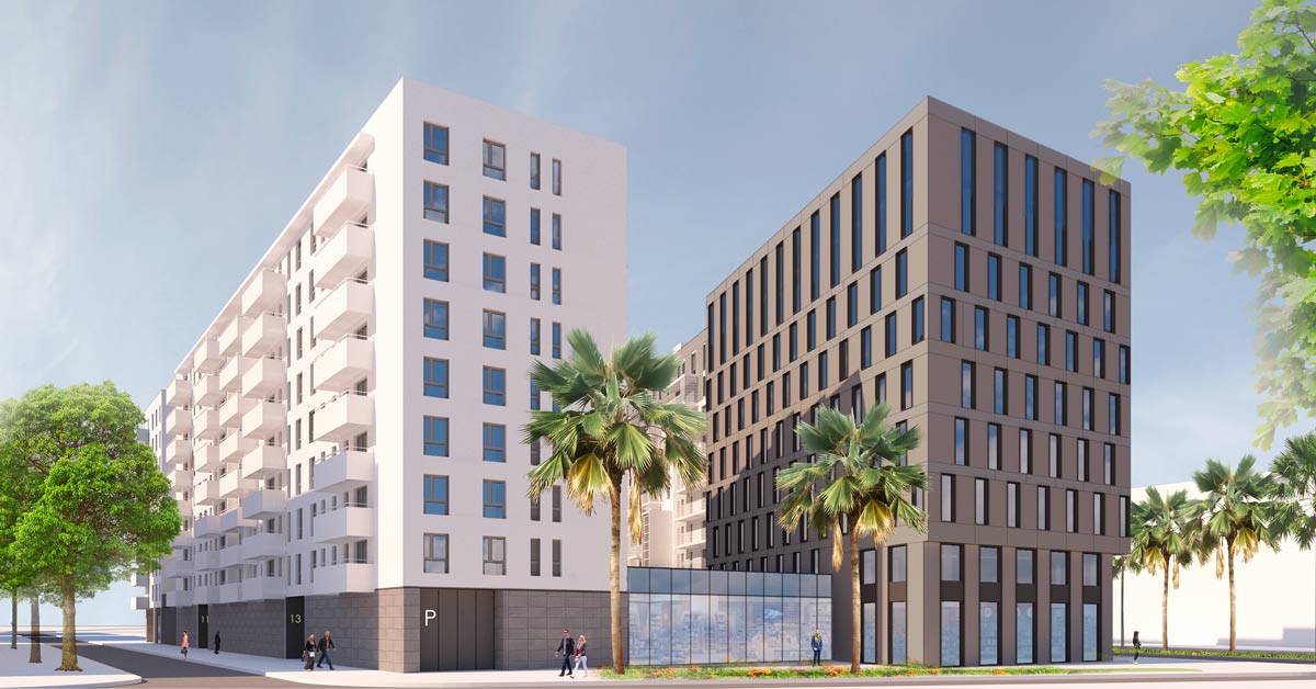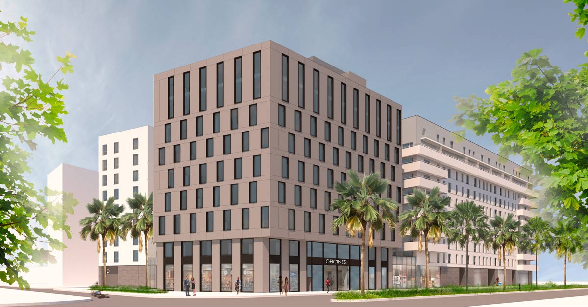 Mur cortina i tancaments d’alumini i vidre per a un nou edifici d’oficines situat al barri de la Marina del Prat Vermell, a Barcelona.