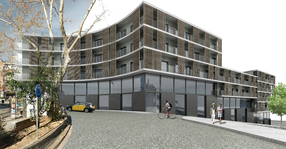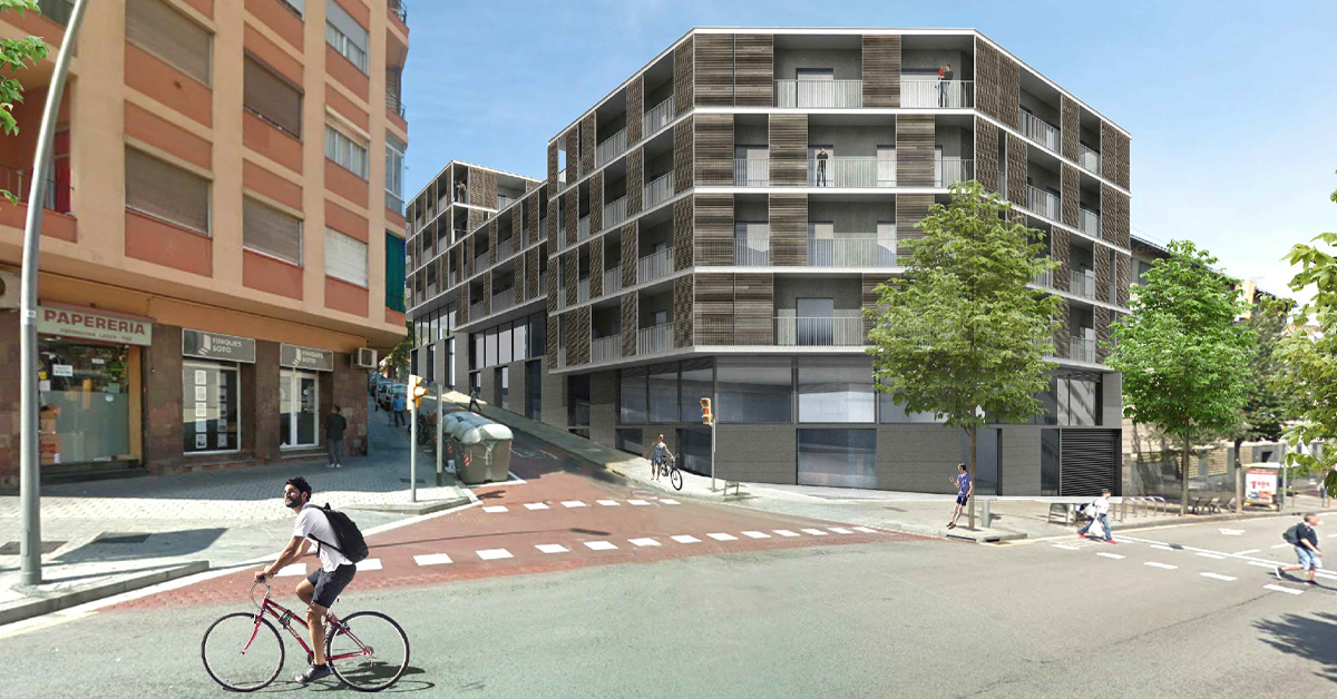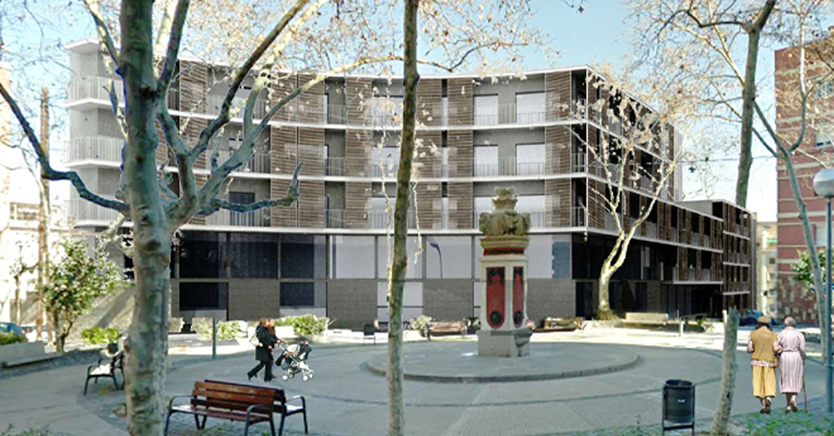 Tancaments d’alumini, vidrieria i treballs en façana per a promoció de 46 habitatges a l’avinguda Montserrat de Barcelona.