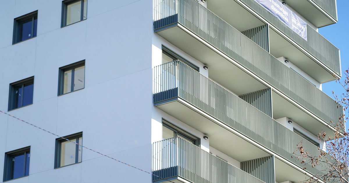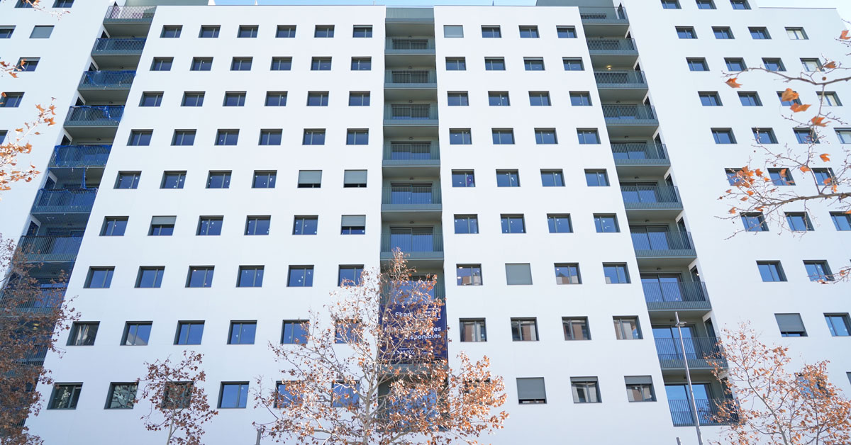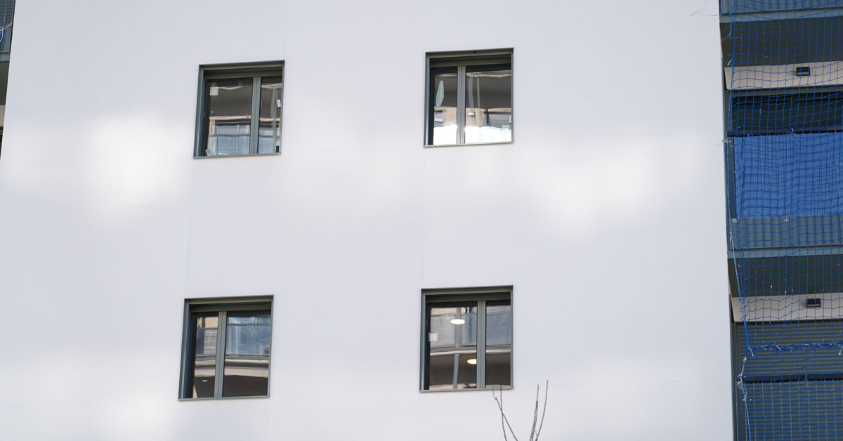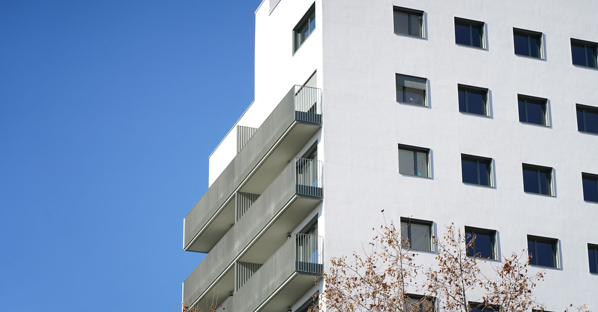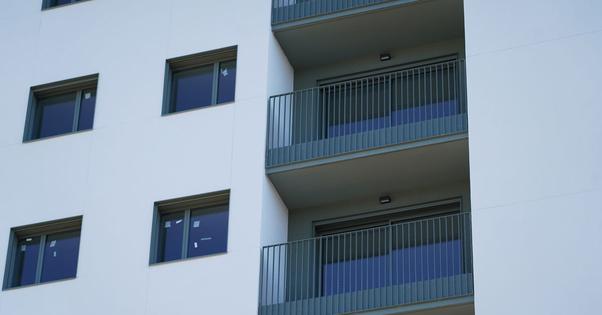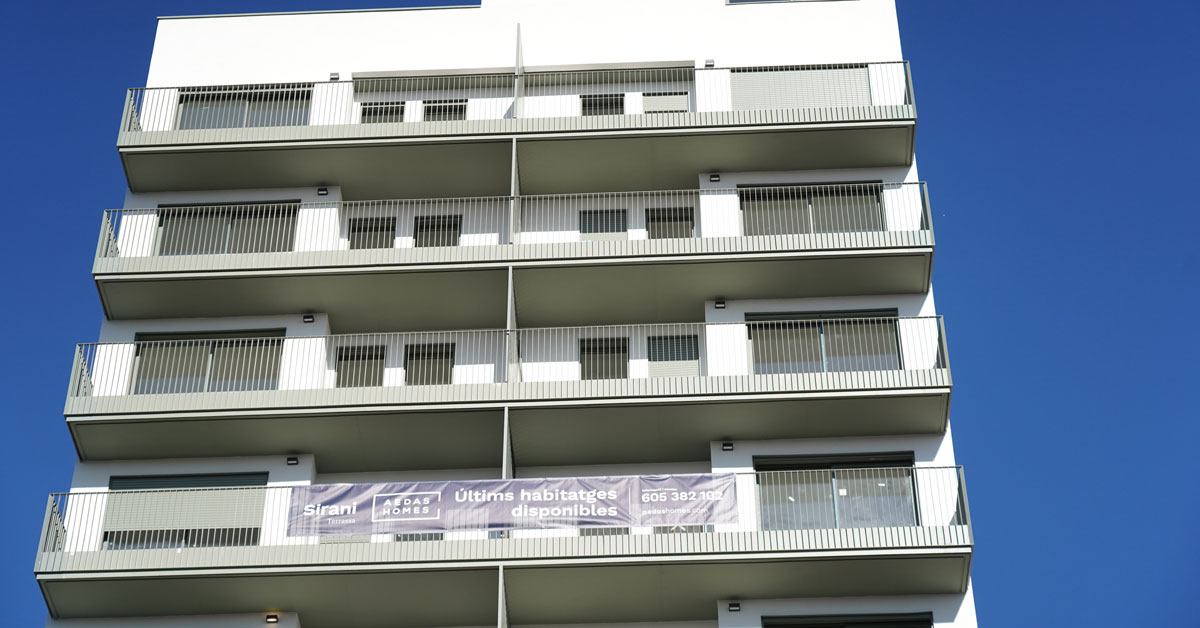 Fabricació i instal·lació de 950 tancaments d’alumini i vidre, d’obertures corredissa i practicable de fulla oculta, amb trencament de pont tèrmic, per a edifici de 87 habitatges de nova promoció a Terrassa.