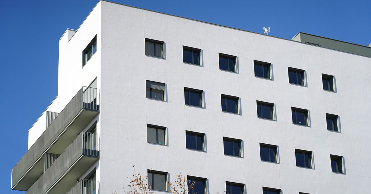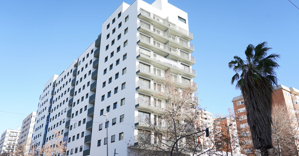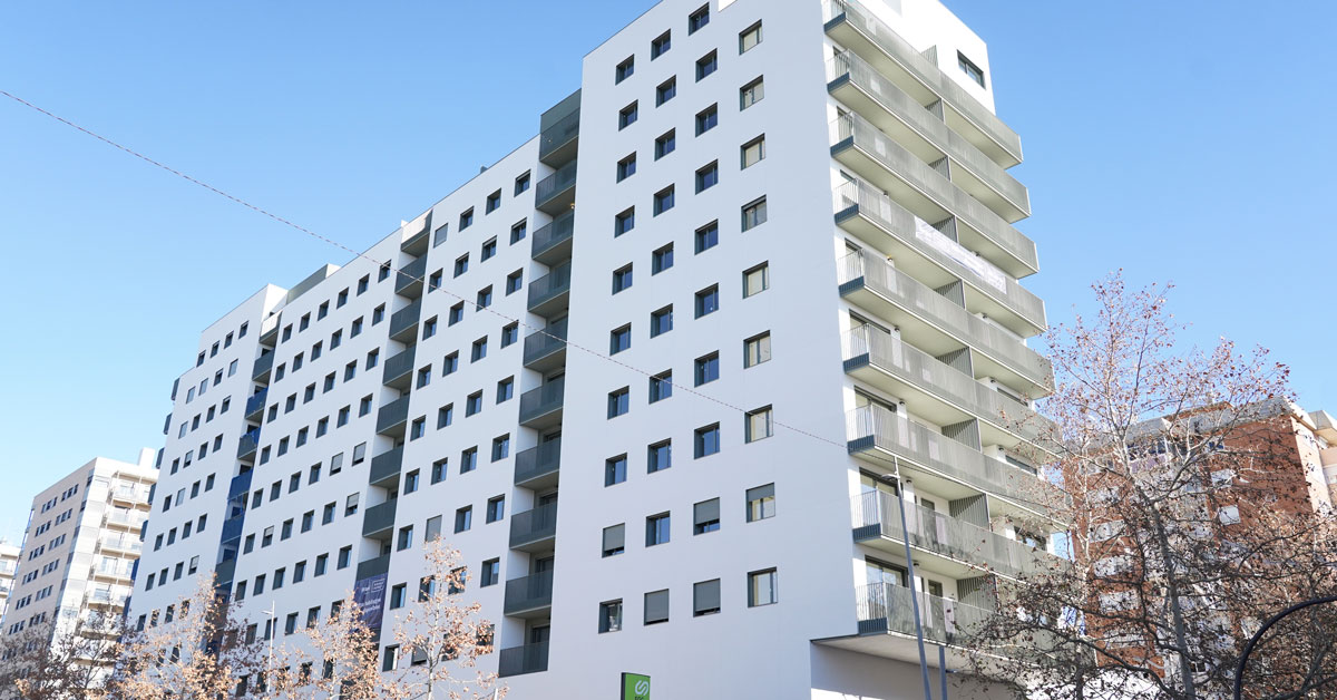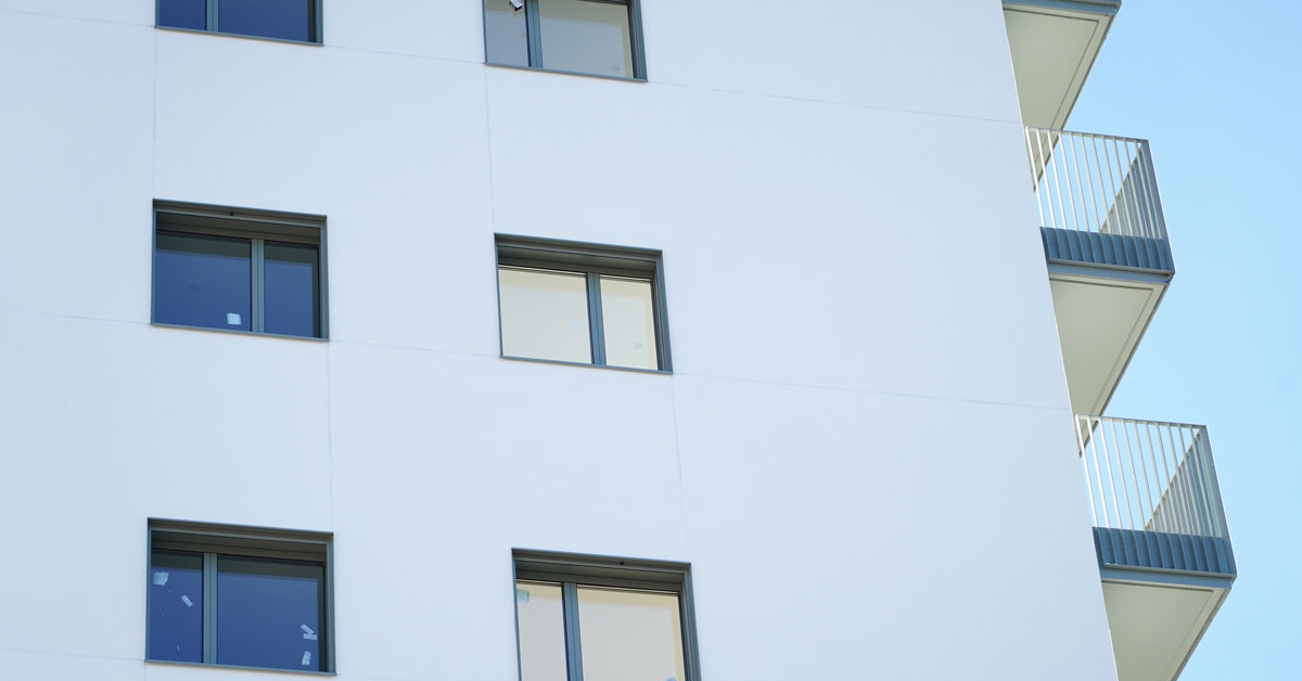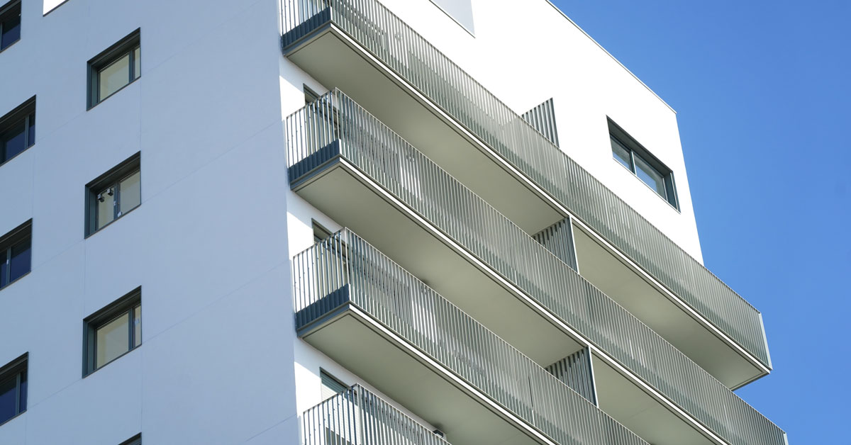 Fabricació i instal·lació de 950 tancaments d’alumini i vidre, d’obertures corredissa i practicable de fulla oculta, amb trencament de pont tèrmic, per a edifici de 87 habitatges de nova promoció a Terrassa.