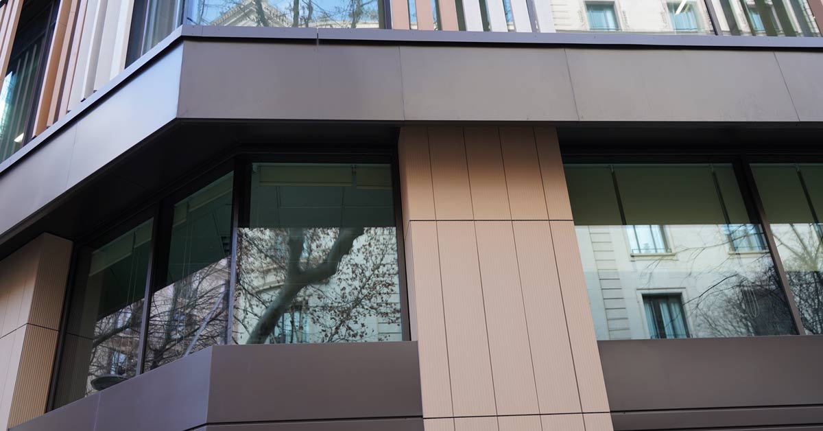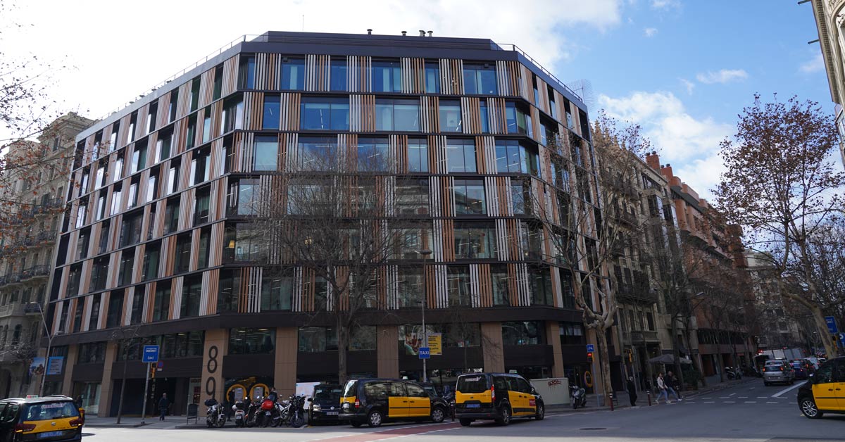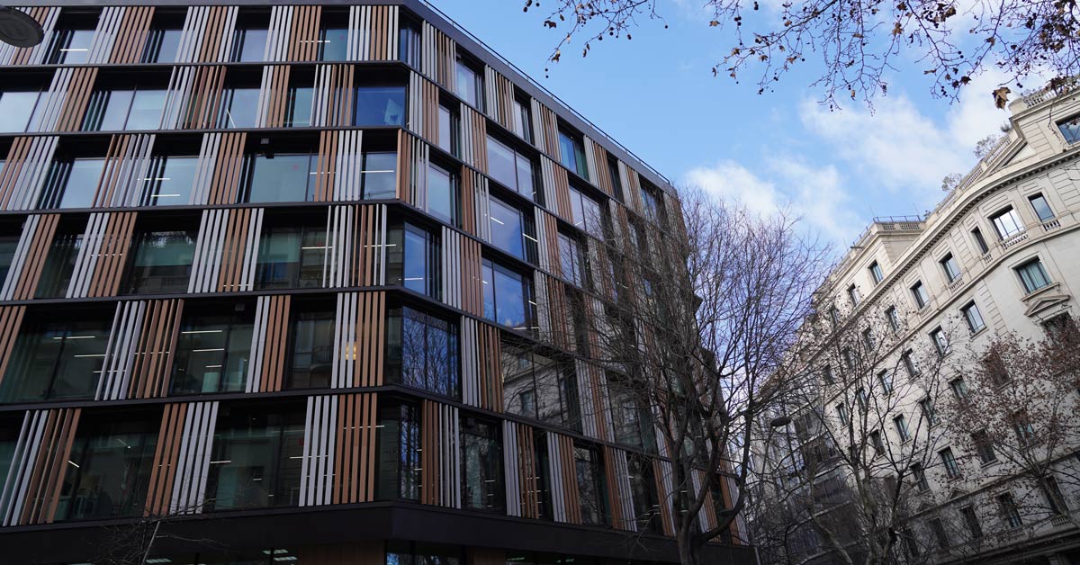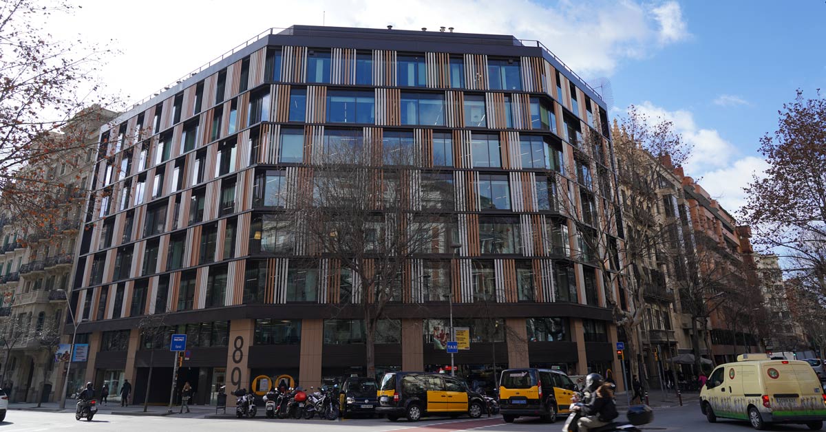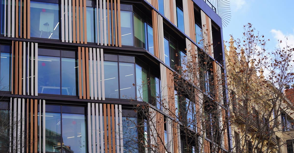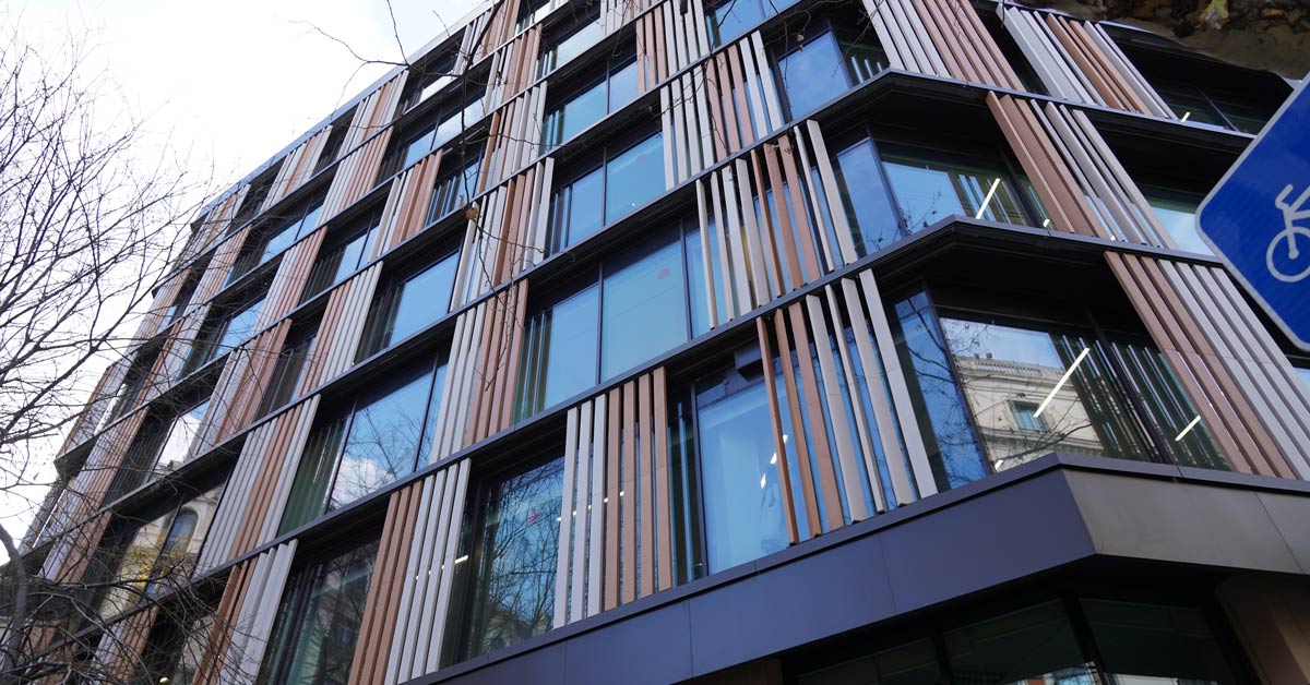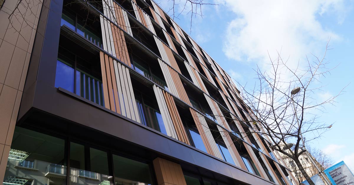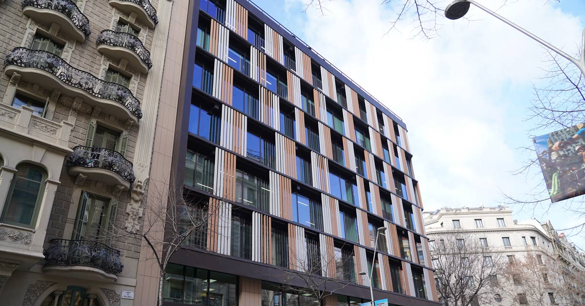Rehabilitació de façana, amb murs cortina i solució de doble pell amb panells de lames ceràmiques en edifici d’oficines al carrer Balmes de Barcelona.
