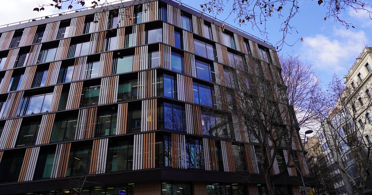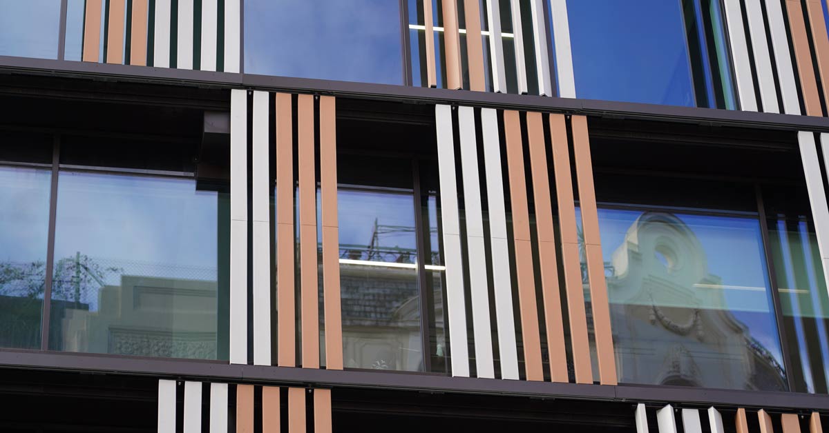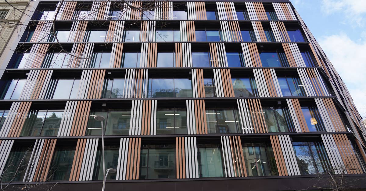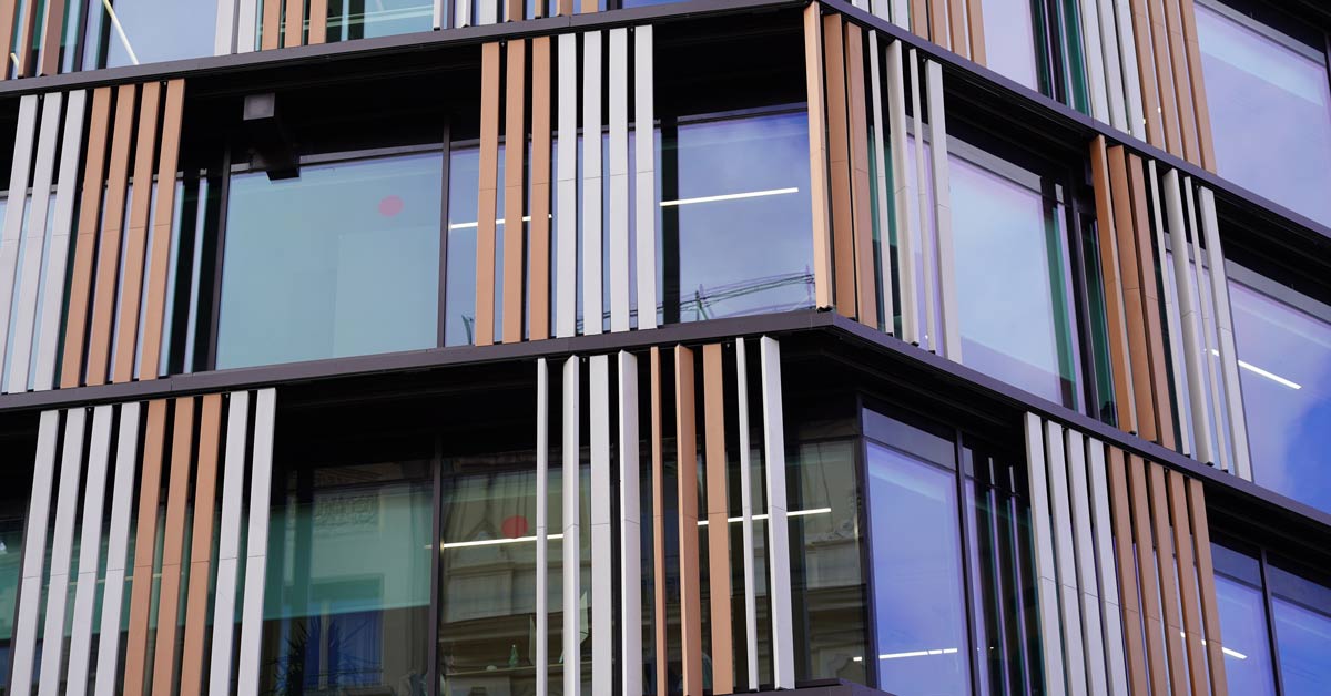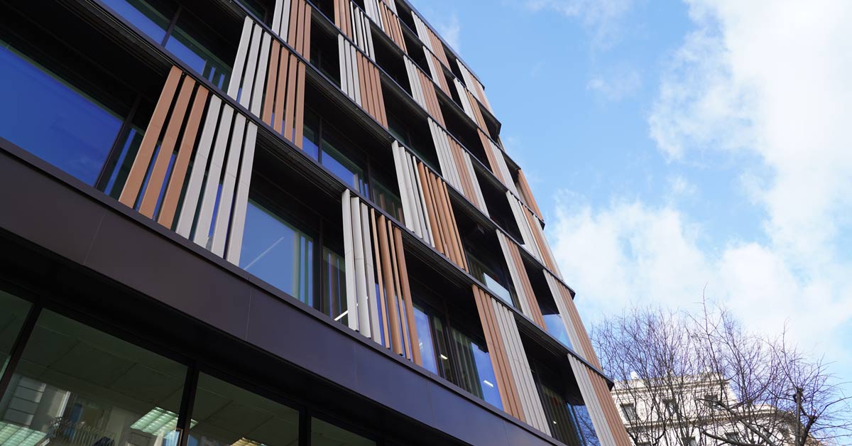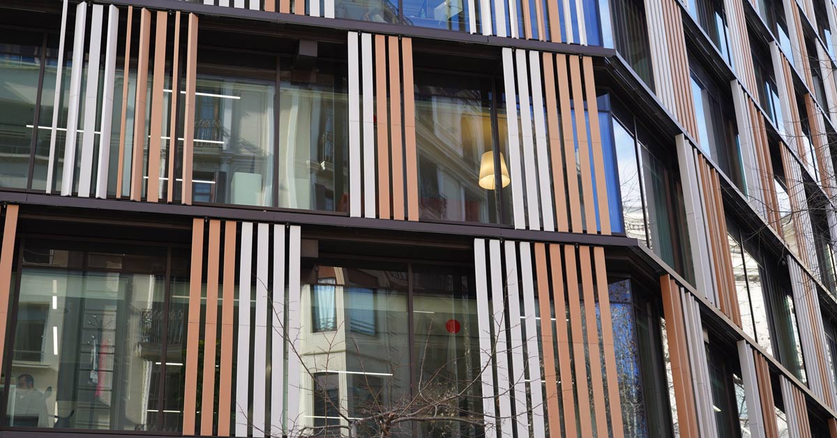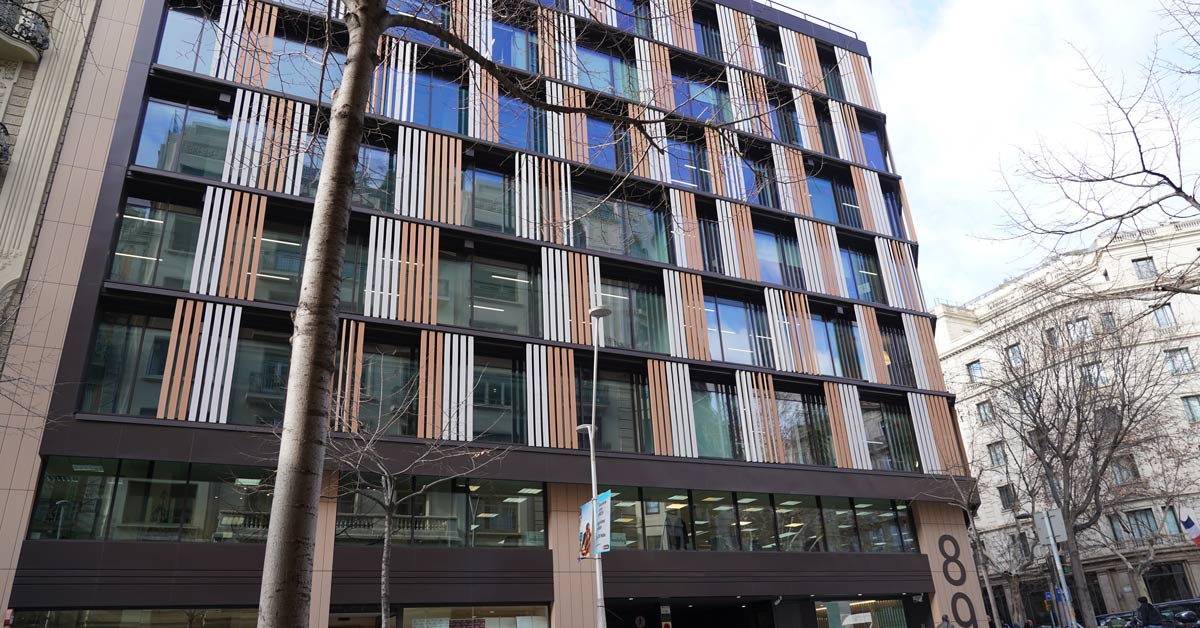Rehabilitació de façana, amb murs cortina i solució de doble pell amb panells de lames ceràmiques en edifici d’oficines al carrer Balmes de Barcelona.