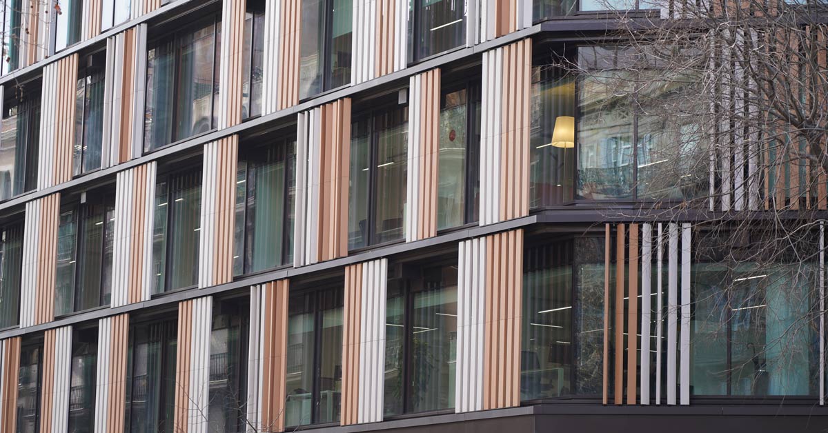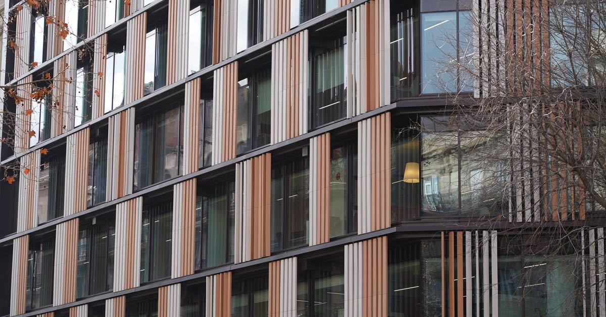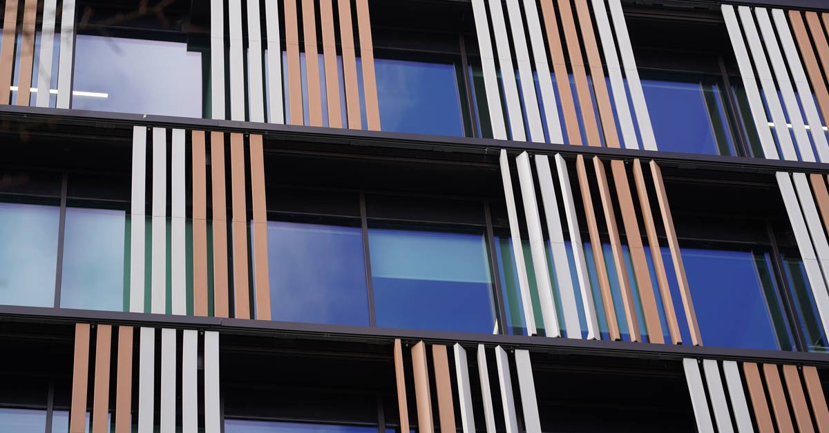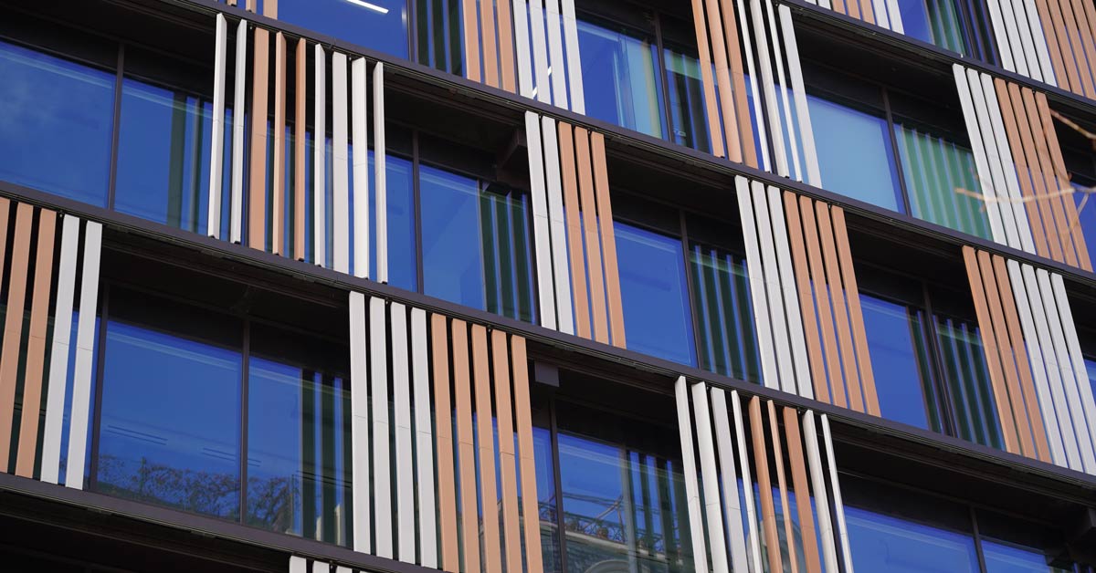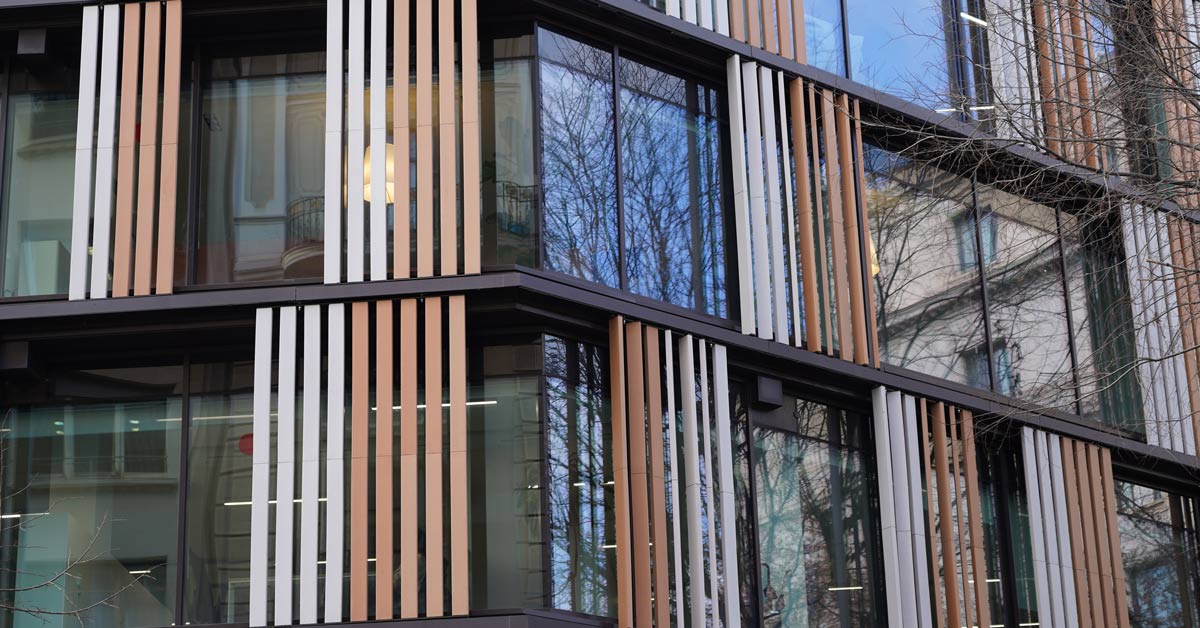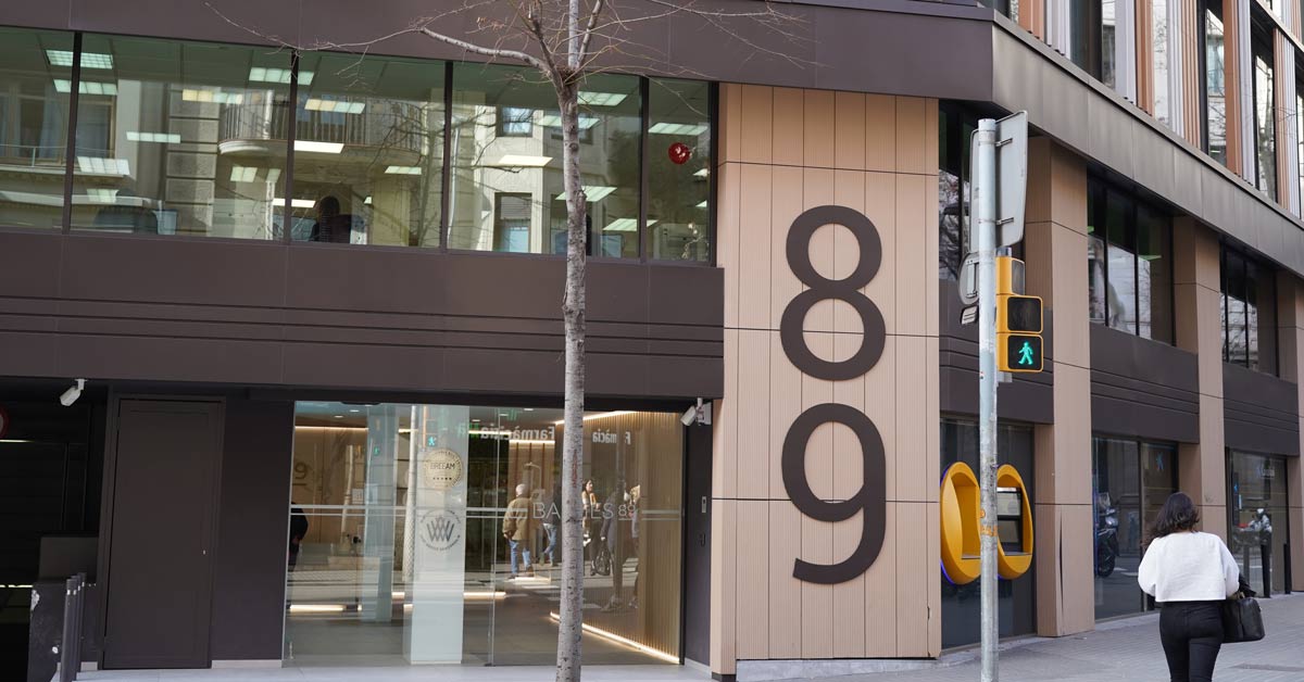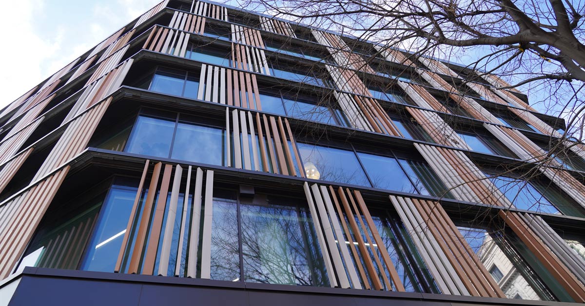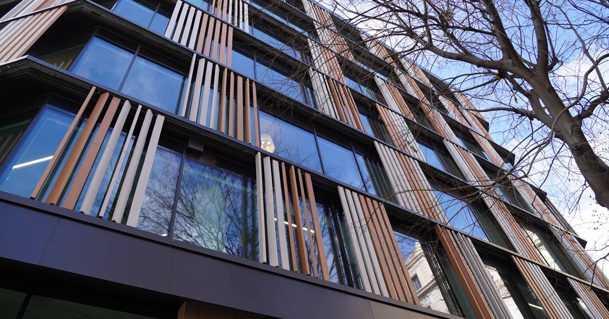 Rehabilitació de façana, amb murs cortina i solució de doble pell amb panells de lames ceràmiques en edifici d’oficines al carrer Balmes de Barcelona.