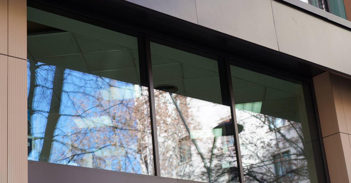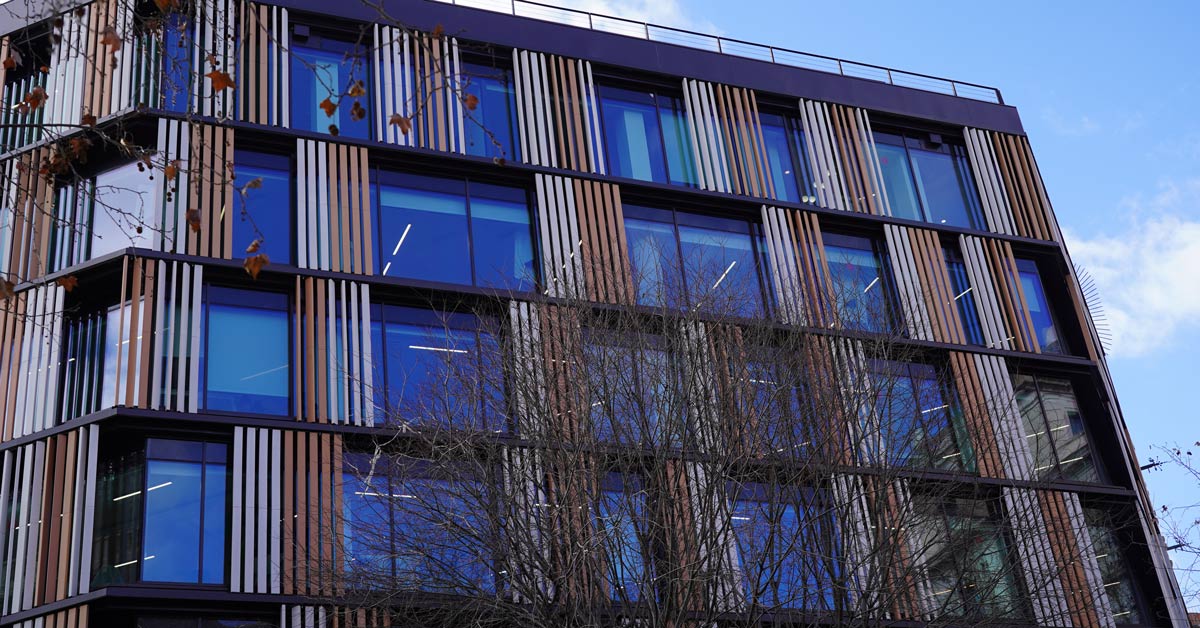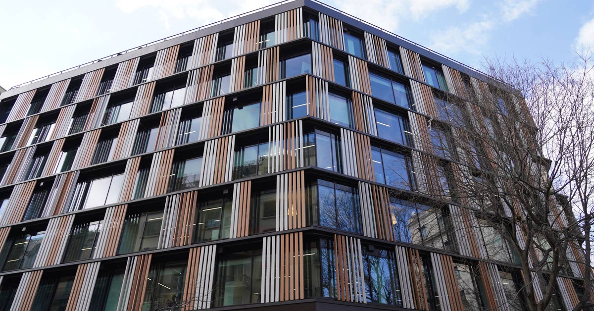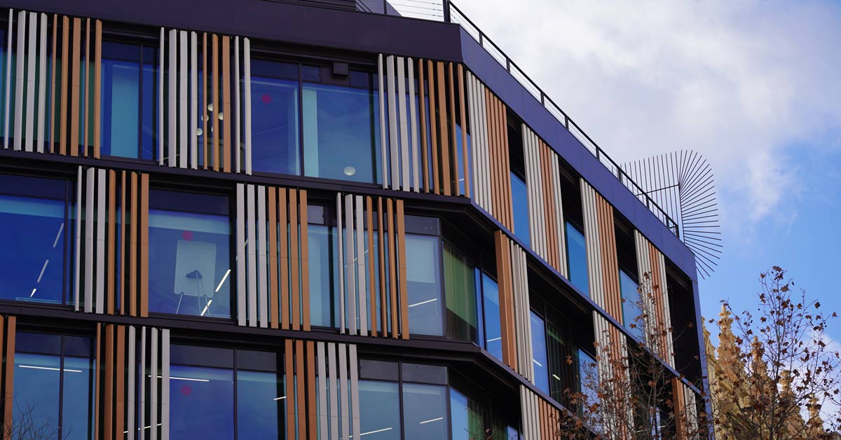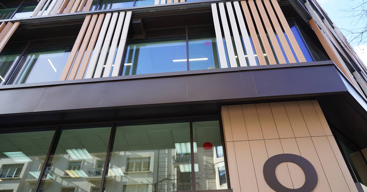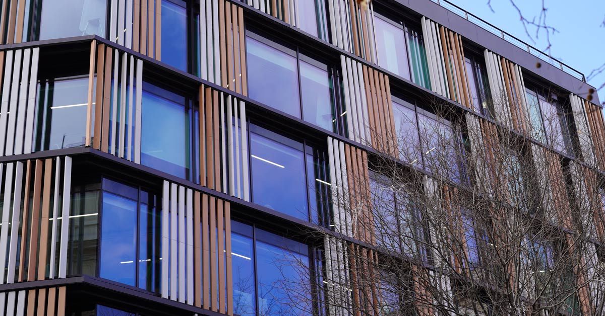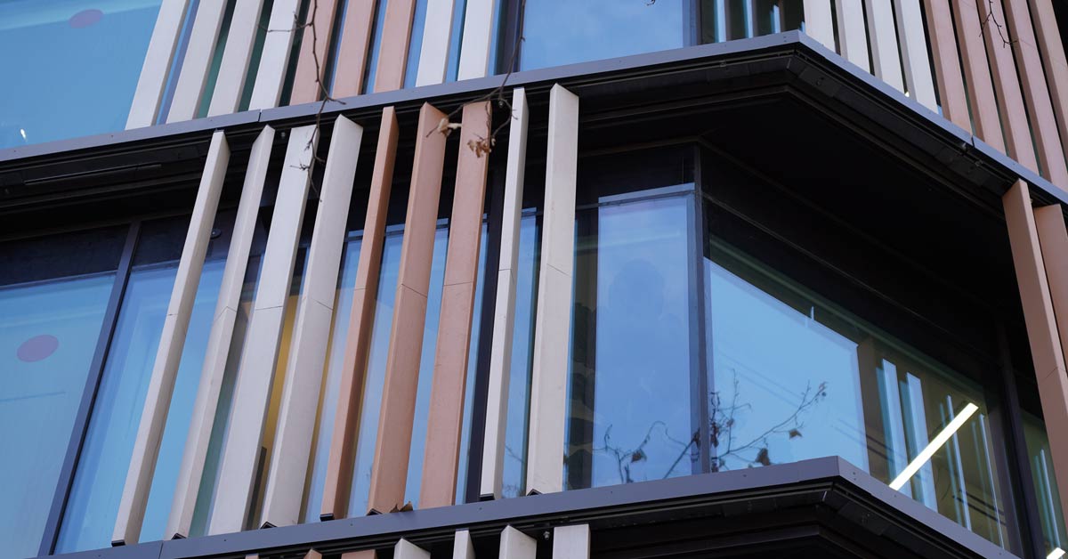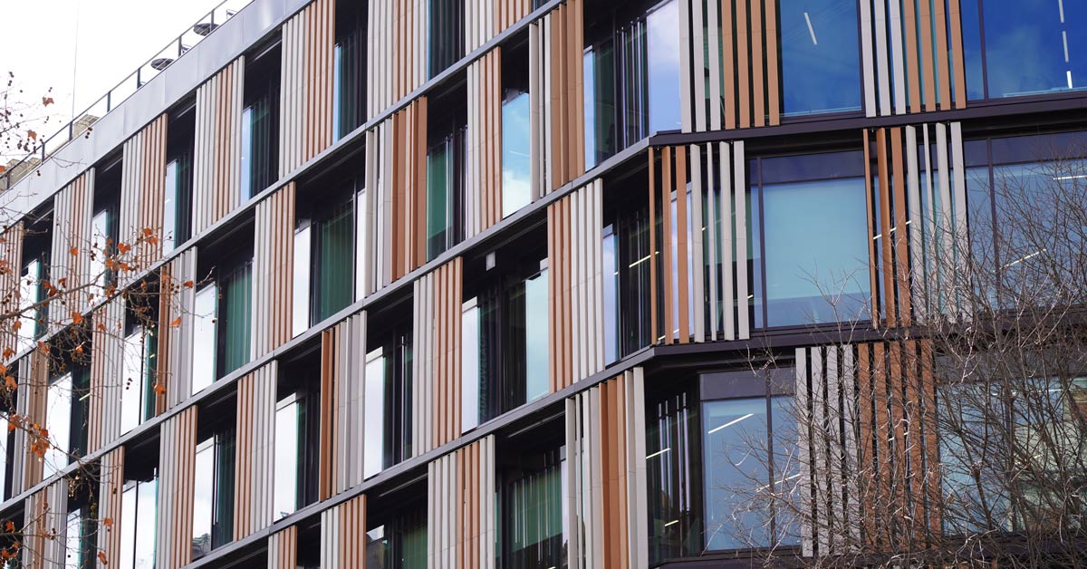 Rehabilitació de façana, amb murs cortina i solució de doble pell amb panells de lames ceràmiques en edifici d’oficines al carrer Balmes de Barcelona.