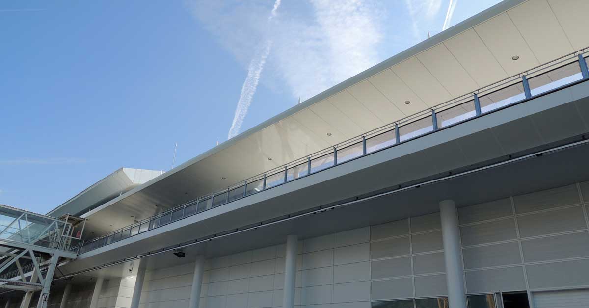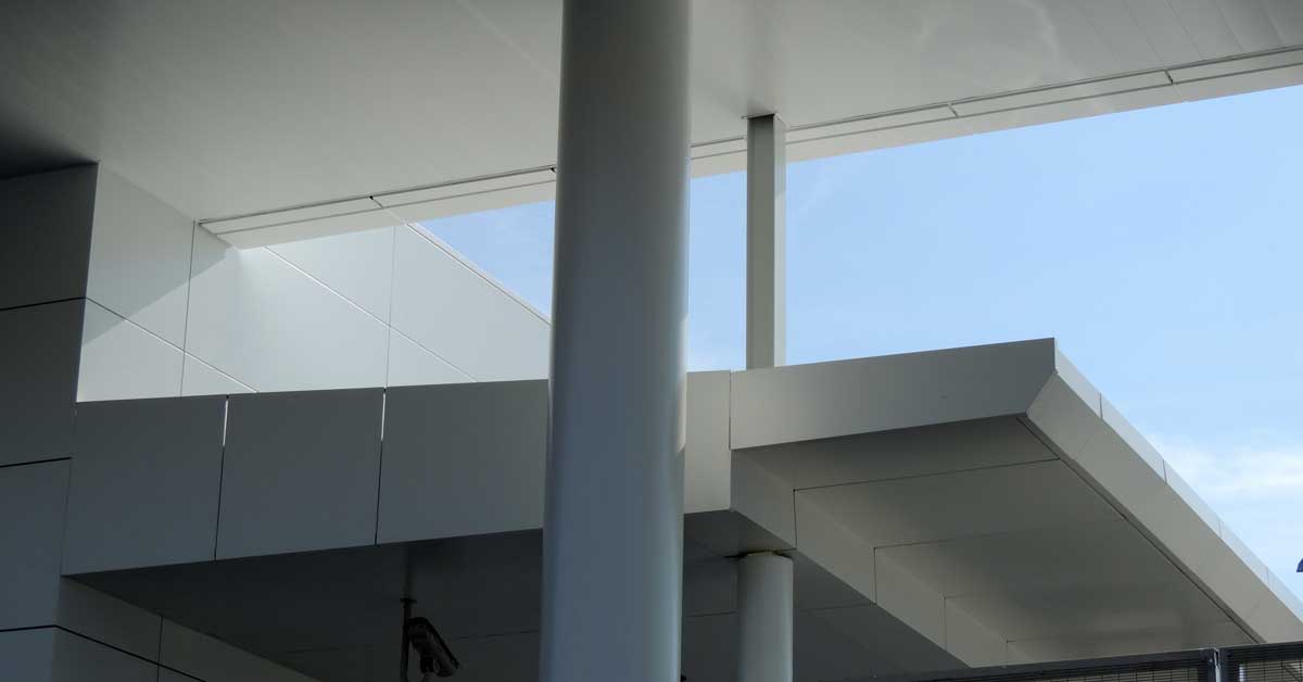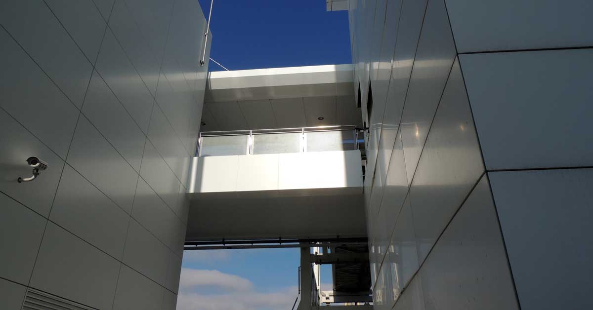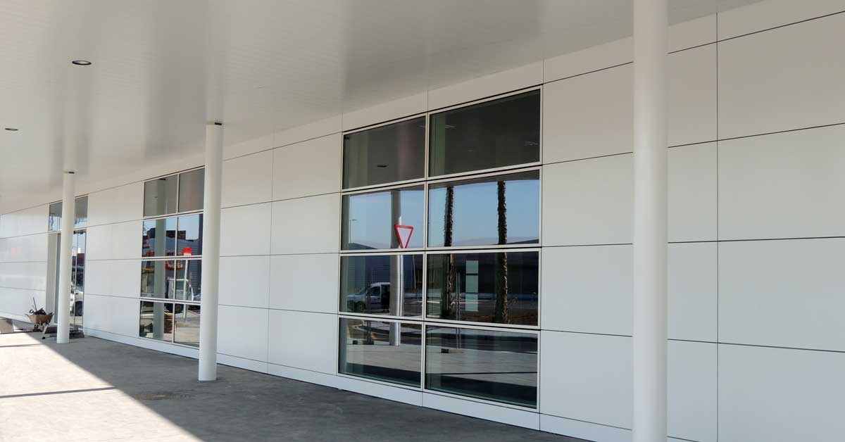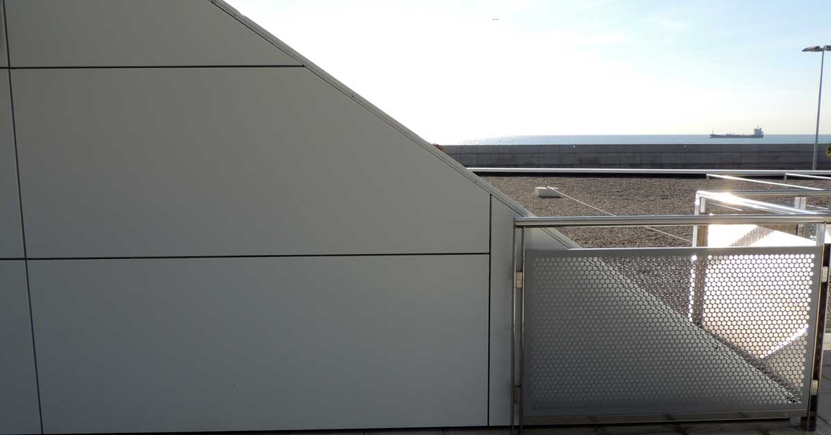 GARCIA FAURA ha fabricat i instal·lat per a aquesta obra més de 2.000 metres quadrats de panell composite, tant en folrats de murs com en marquesines i passarel·les. El sistema de revestiment de façana, d’especial complexitat, ha requerit d’unes exigències en instal·lació a l’abast de pocs industrials. Una de les principals característiques d’aquest panell són els seus acabats ignífugs i d’alta resistència a la salinitat, donada la proximitat al mar. El sistema de revestiment de façana ventilada, a més, ha obtingut el DIT (Document d’Idoneïtat Tècnica) que garanteix els materials, sistemes i procediments no tradicionals de construcció emprats en edificació i obres públiques. Aquest certificat verifica el disseny de la instal·lació del producte, complint l’estricte procediment d’ancoratge i nivell d’omegues requerit.